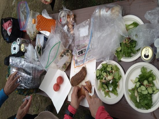 コンロで湯を沸かして、持参したアルファ米、カレーうどん、即席五目ライスなど調理します。