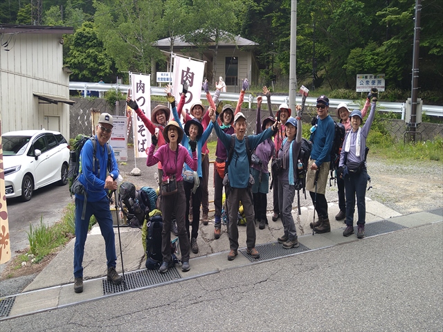 やったー!!柳沢峠バス停に着きました。皆さん、達成感で輝いています。