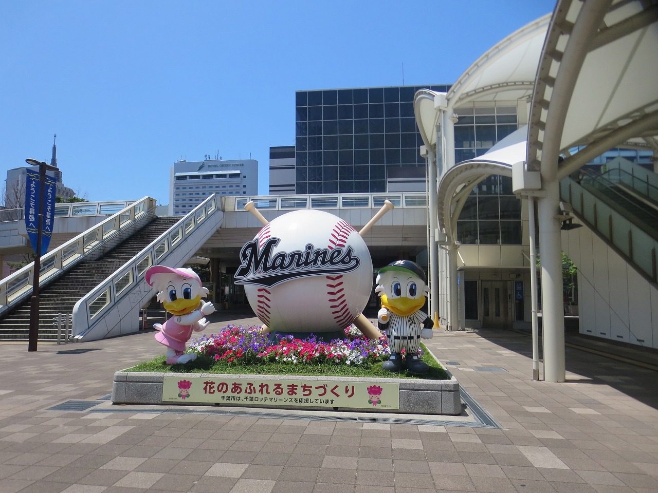 集合の海浜幕張駅といえば、千葉ロッテマリーンズの駅。駅前広場には球団のモニュメントが。