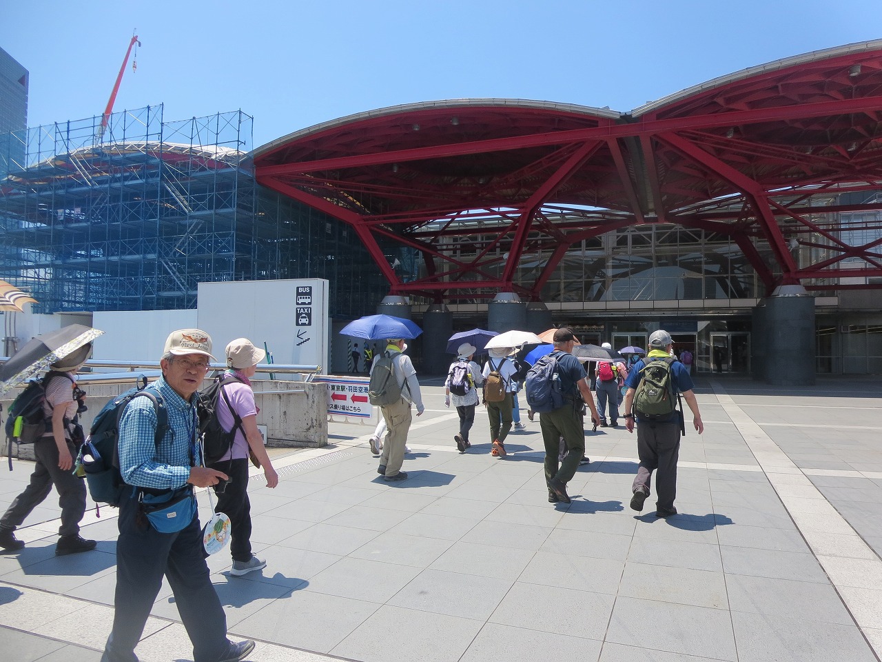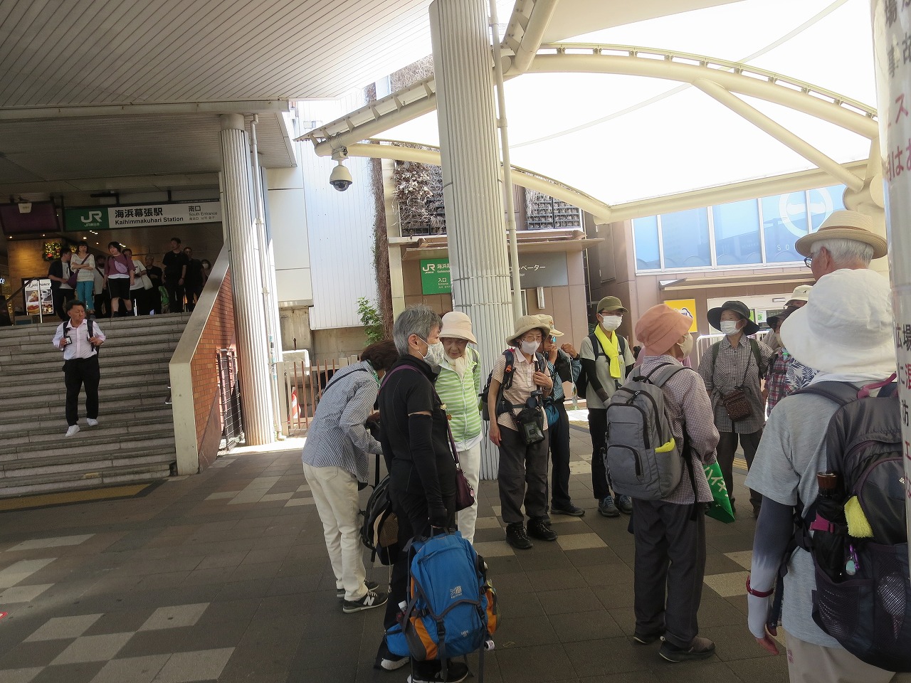 駅 南口広場でリーダー挨拶。本日は幕張メッセにて「第7回 国際 建設・測量展」が開催されていて電車が到着毎に奥の階段から人の波が押し寄せていた。