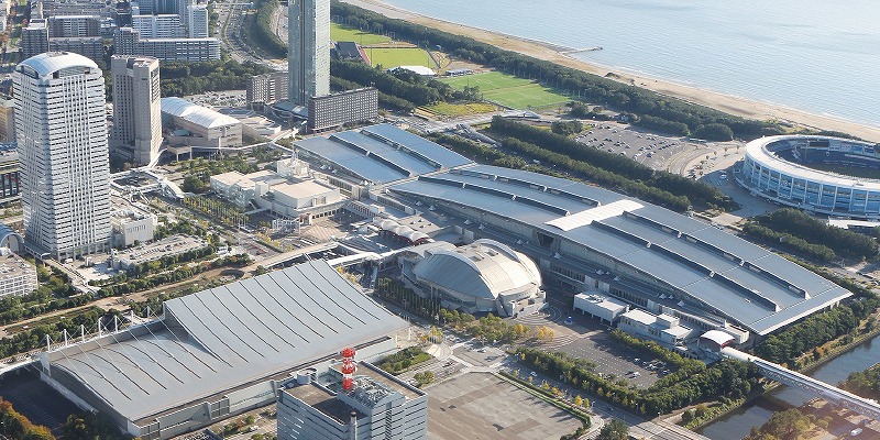 幕張メッセ全景。施設が巨大な建築物のためHPから写真をお借りし説明します。右奥の円形は「ZOZOマリンスタジアム(千葉ロッテマリーンズ)」。球場の奥は東京湾最深部。球場左に駐車場。その左の芝面は「JFA夢フィールド」。球場下方の巨大な屋根と左下の屋根は幕張メッセの国際展示場です。