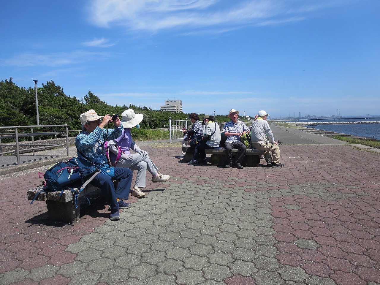 検見川の浜。奥に稲毛の浜と続きますが、暑さに限界を感じた方がいたためここで一次解散。「稲毛の浜」は中止してバスで「稲毛海岸駅」へ。