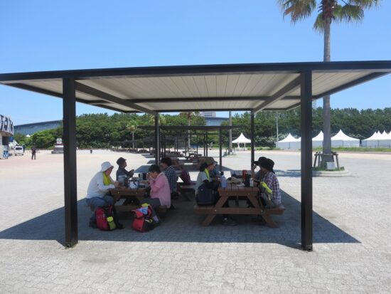 球場前の休憩所? 強烈な日差しを避けてゆっくり休みながら昼食。