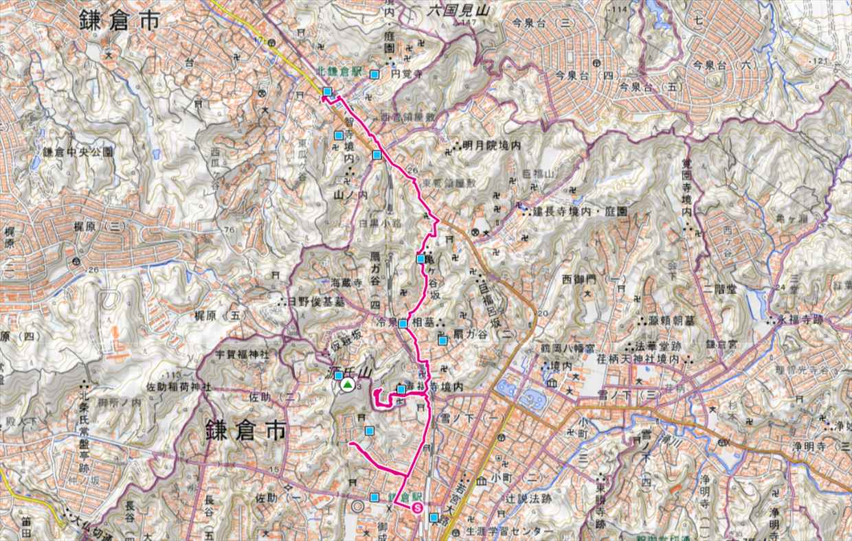 JR鎌倉駅10:05→10:35寿福寺10:57→岩船観音11:19→亀ヶ谷坂→11:45北鎌倉駅(昼食)12:20=12:25大船駅=12:50田谷の洞窟13:35~48田谷洞窟バス停=13:57大船駅→14:09大船観音寺14:45→14:50大船駅