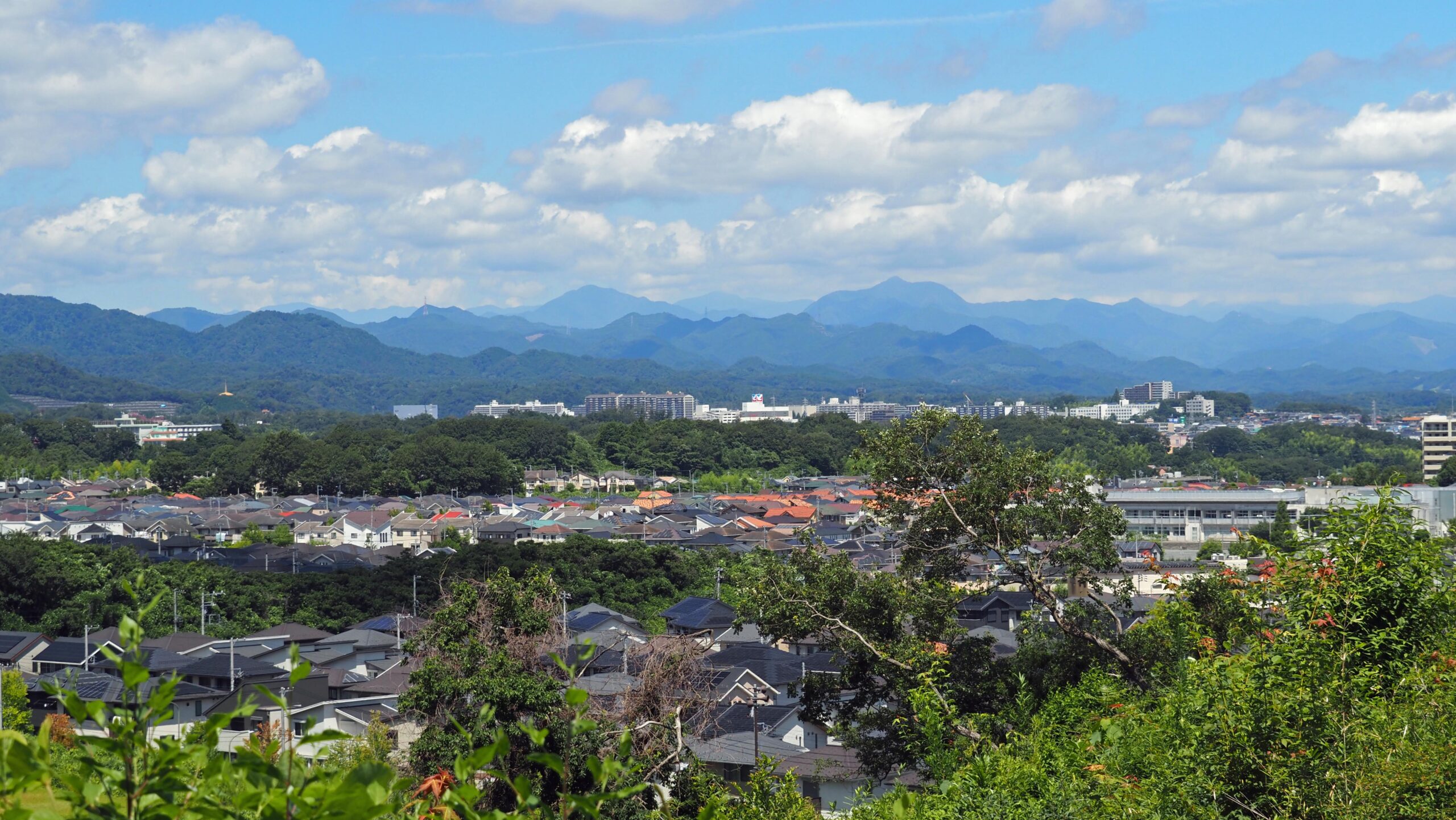 急に、視界が開けてきた。前方に奥多摩の山々の展望 中央右側の山は大岳山