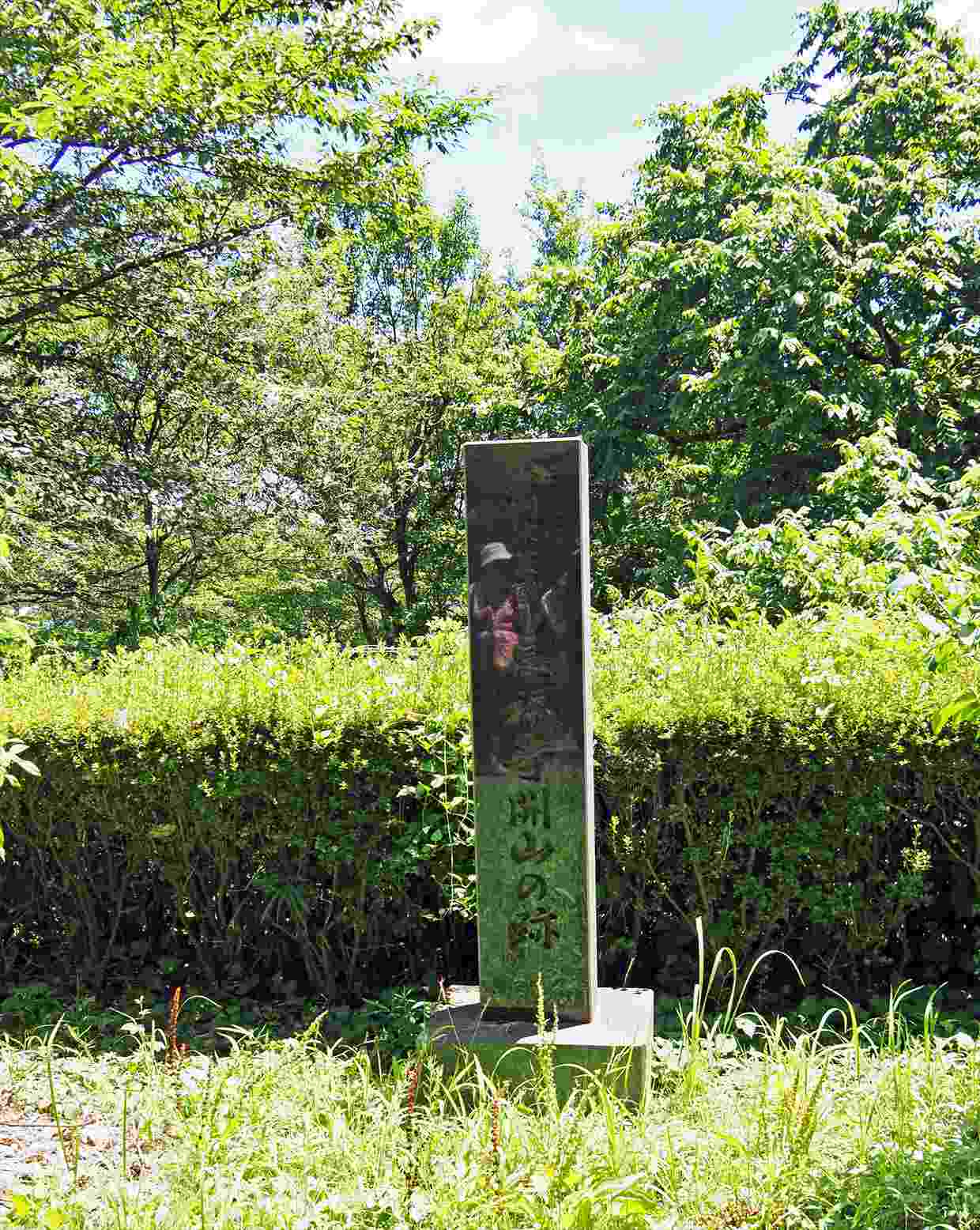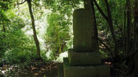 急降下、鋼製の手すりを掴まりながら下ると、供養塔が建っていた。