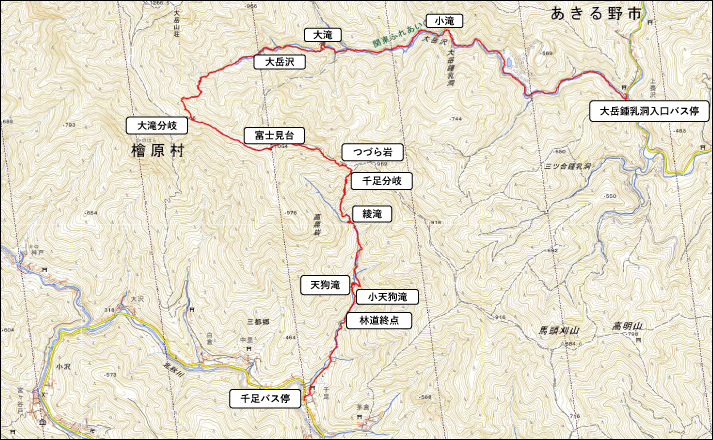 ▼コース : 大岳鍾乳洞入口バス停 9:00 – 9:30 大岳鍾乳洞 – 9:35 小滝 – 10:00 大滝登山口 – 10:05 大滝 – 11:25 大滝分岐 – 11:45 富士見台(昼食) – 12:40 つづら岩 – 12:45 千足分岐 – 13:15 綾滝 – 13:40 天狗滝 – 13:55 小天狗滝 – 14:05 林道終点 – 14:20 千足バス停 = 武蔵五日市駅