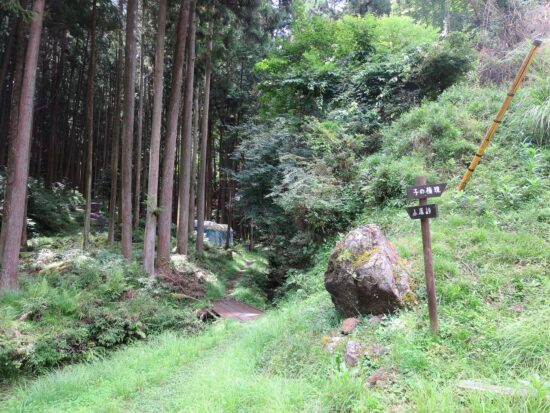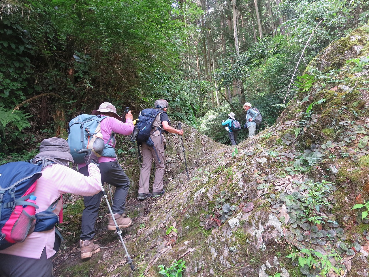 途中で女性1名下山。駅から続く舗装道路の終点:静之神社から30分の「天寺へ十二丁石」。一人で下山も問題なしと判断した。後ほど「駅に着いた」とMailを受けました。