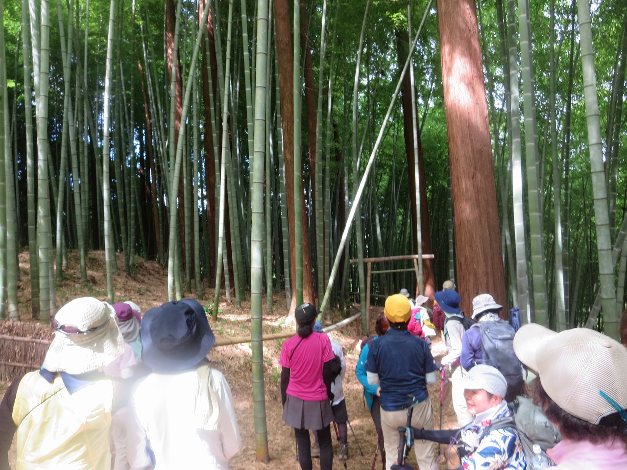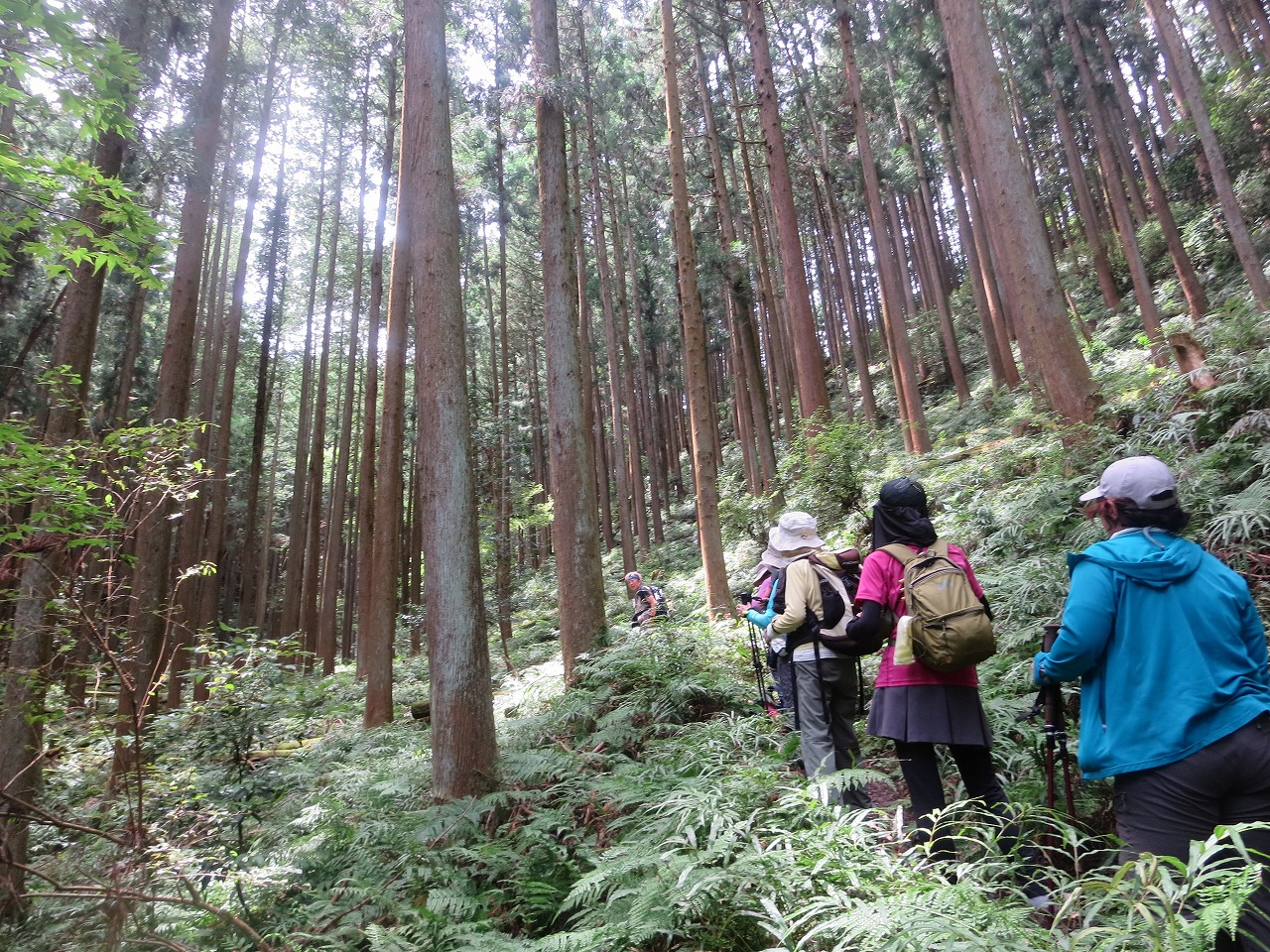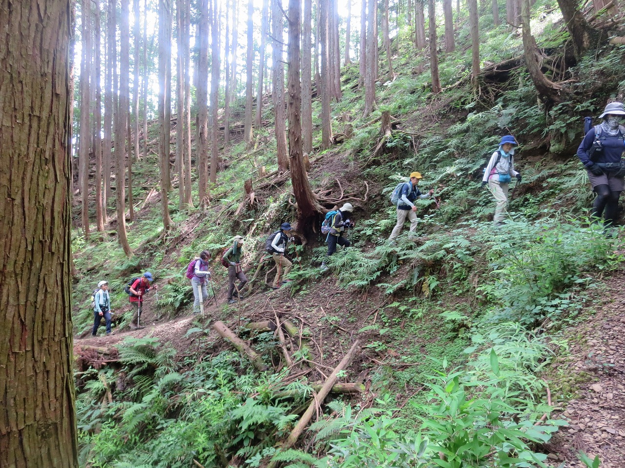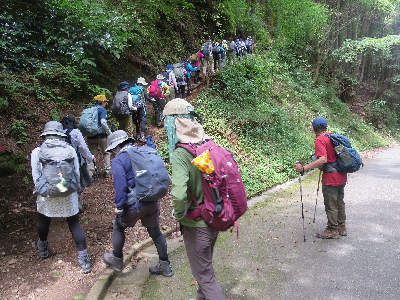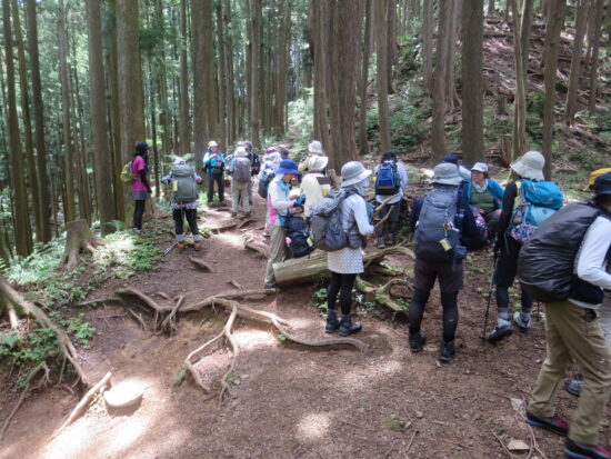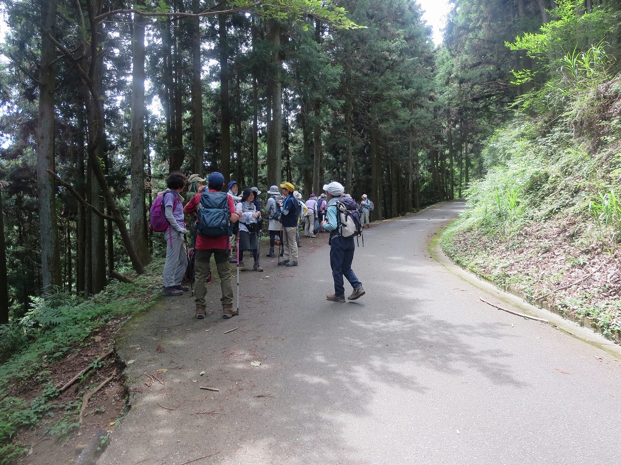 リーダ-コメント:熱中症警戒アラートは発出されていませんが、真夏並みの気温は予報されていた。水分の補給、そして前を歩く人との間隔が50m以上開いて見えなくなるようなら、「間が空いています」と声を掛け、間を詰めるように伝えて出発。山の中の谷筋は無風で蒸し暑い。やがて林道に出る。子の権現、竹寺と周り「小殿バス停」。