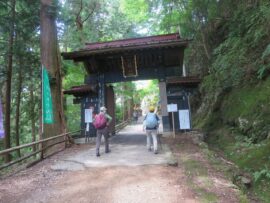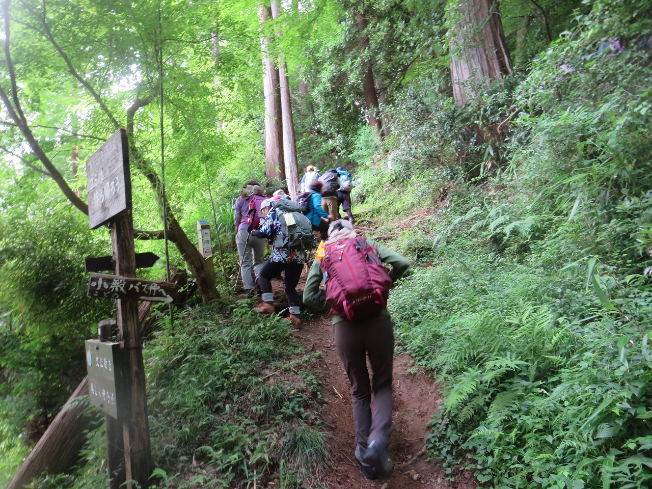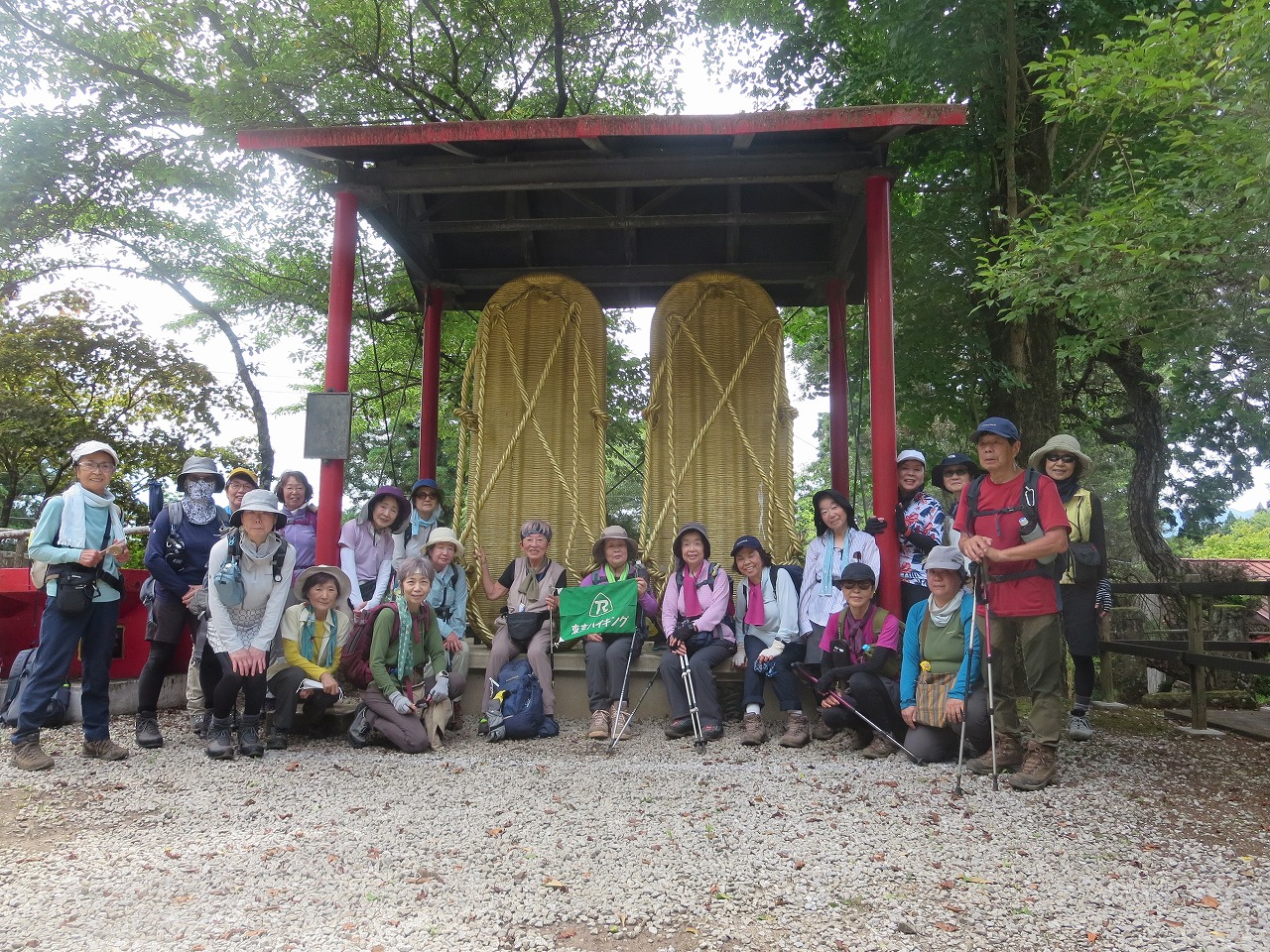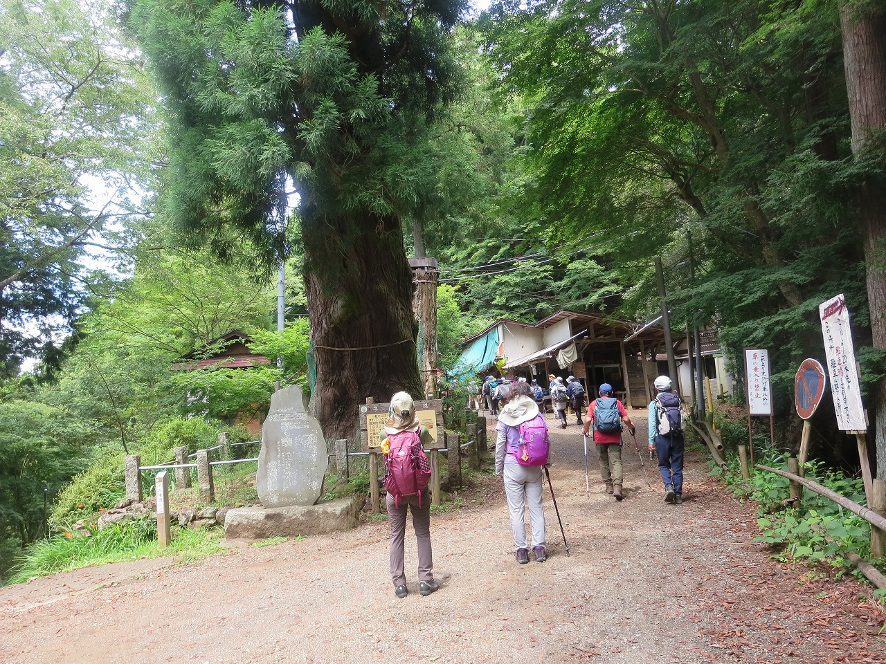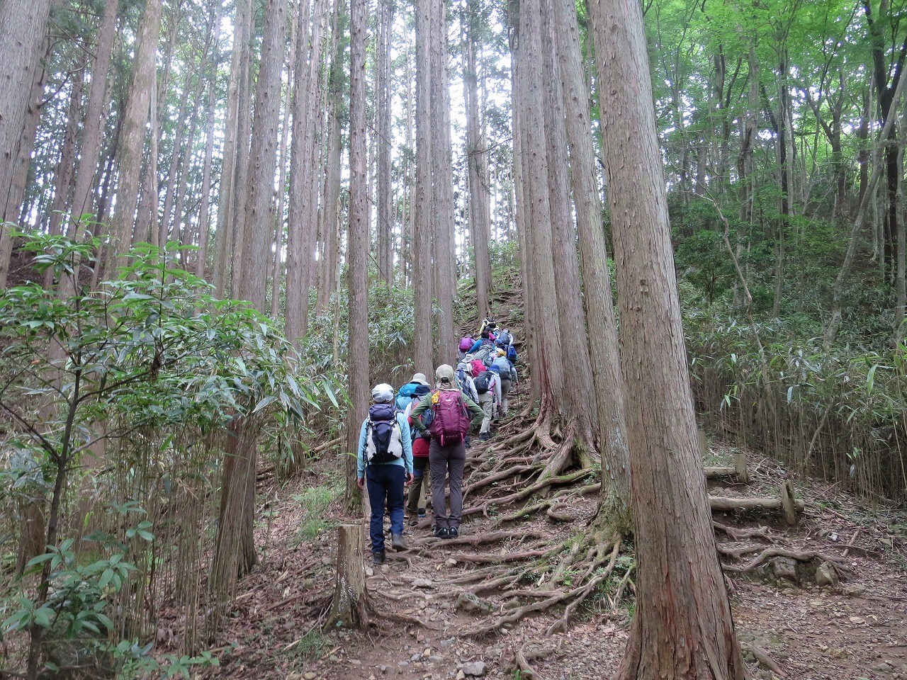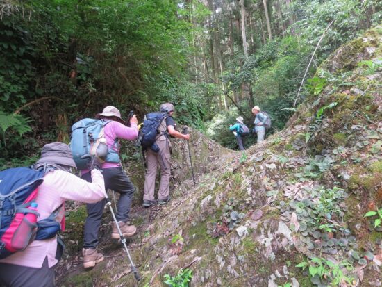 リーダ-コメント:熱中症警戒アラートは発出されていませんが、真夏並みの気温は予報されていた。水分の補給、そして前を歩く人との間隔が50m以上開いて見えなくなるようなら、「間が空いています」と声を掛け、間を詰めるように伝えて出発。山の中の谷筋は無風で蒸し暑い。やがて林道に出る。子の権現、竹寺と周り「小殿バス停」。