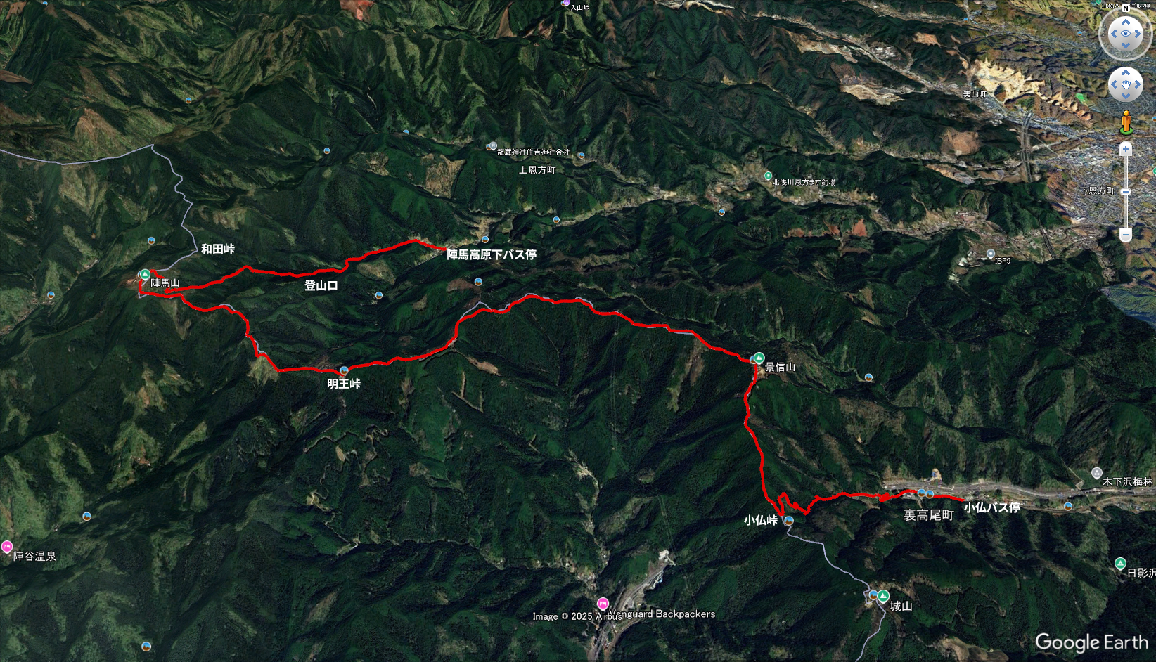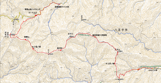 | 「コース案内」 スタート:陣馬高原下バス停~陣馬山新ハイキングコース入口~陣馬山~明王峠~底沢峠~新多摩線72号鉄塔~景信山~ヤゴ沢ノ頭~小仏峠~小仏林道終点(旧甲州街道)~景信山登山口~小仏バス停・ゴール地点 距離:12.5km 、所要時間:6時間42分。 (GPSデータ参照) ================================================================= |