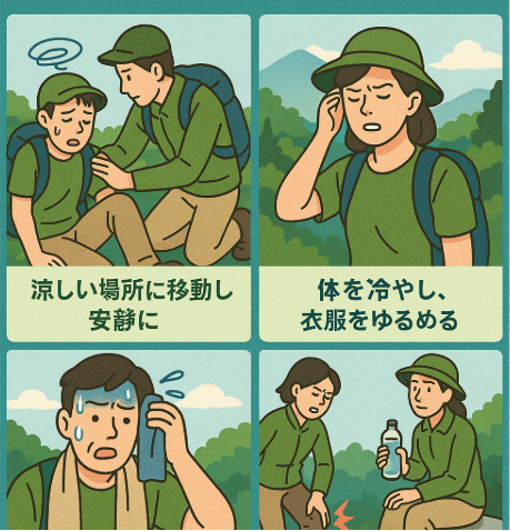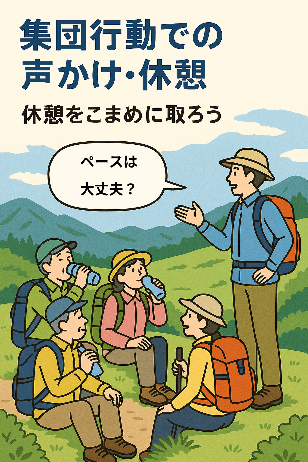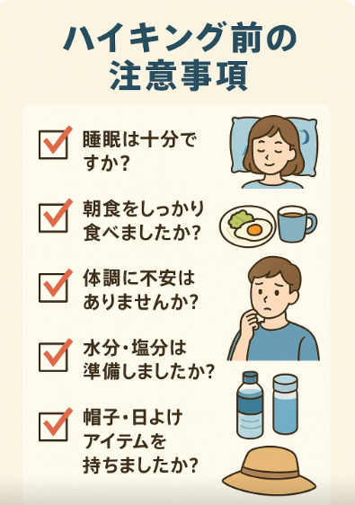 | 夏場の登山・ハイキングでは、特に熱中症のリスクが高まります。 個人の注意はもちろん、グループ全体での意識と連携が大切です。 以下に「出発前」「ハイキング中」の具体的な熱中症対策をイラスト付きで紹介します。 ///////////////////////////////////////////////////////////////////////////////////////////////////////// ハイキング前の注意事項チェックリスト出発前に、体調や装備の準備をチェックしましょう。 熱中症の初期症状と応急対応暑さで気分が悪くなったら、すぐに日陰で休み、水分・塩分補給を。 グループで声をかけ合おう「こまめな休憩」「無理しないペース配分」「体調異変の早期共有」が重要です。 のどが渇く前に水分補給!水分補給は「15~20分に一口」が目安。 みんなで予防、安心ハイキング!熱中症は誰にでも起こりえます。体調に少しでも不安があれば無理せず、 異変に気づいたらすぐにリーダーに相談しましょう。 万全な準備と仲間との連携で、安全・快適な ハイキングを楽しみましょう。 |