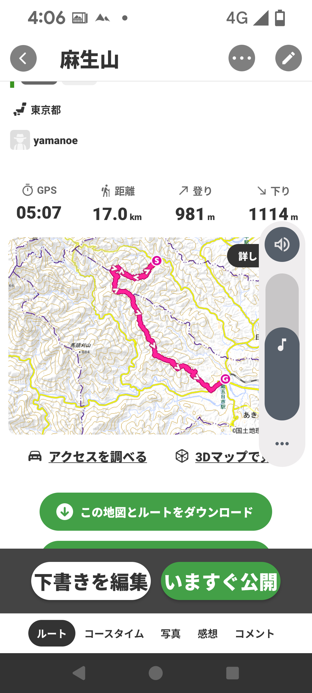 ▼歩 程: 5時間7分(休憩含む) 距離17km(登り981m、下り1114m)