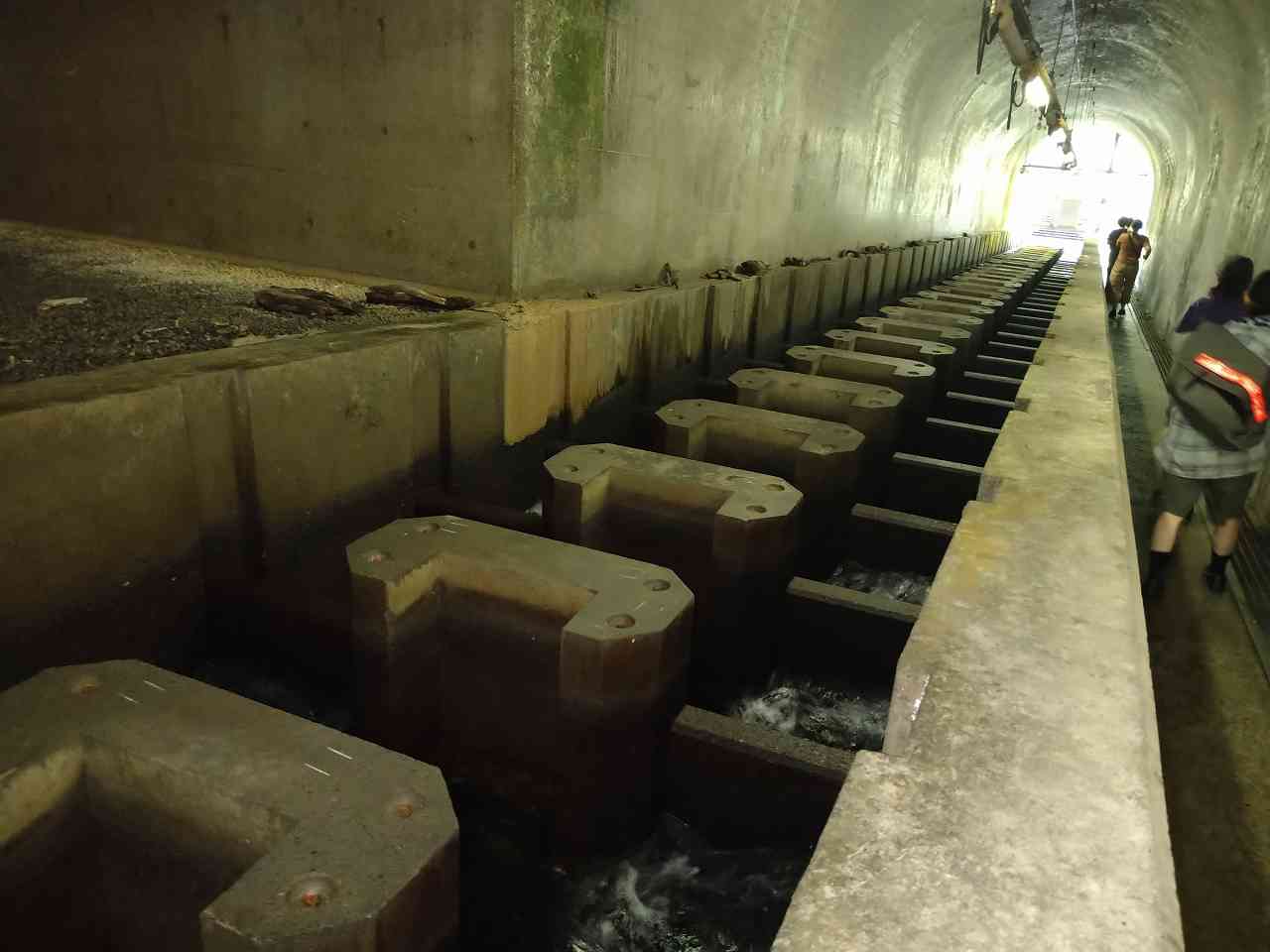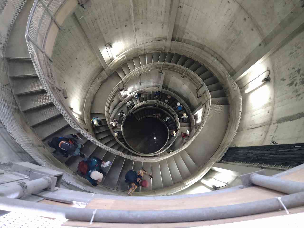 管理棟から螺旋階段を30m下り、魚道を見学に行きます。とても冷んやりしています。