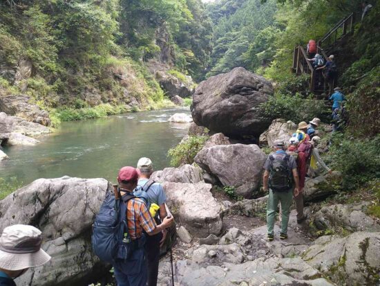鳩ノ巣渓谷を進んで行きます。巨大な岩がゴロゴロしています。左側は変成岩、床は堆積岩です。