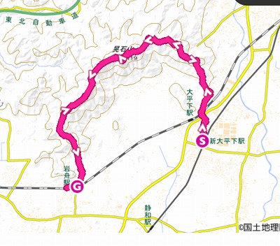 新大平下駅9時24分 →10時24分謙信平 →10時43分太平山神社 →11時5分太平山 →11時38 分ぐみの木峠 →12時22分晃石神社(昼食→晃石山) →13時14分青入山 →13時40分さくら峠 →14時24分馬不入山→15時56分岩舟駅