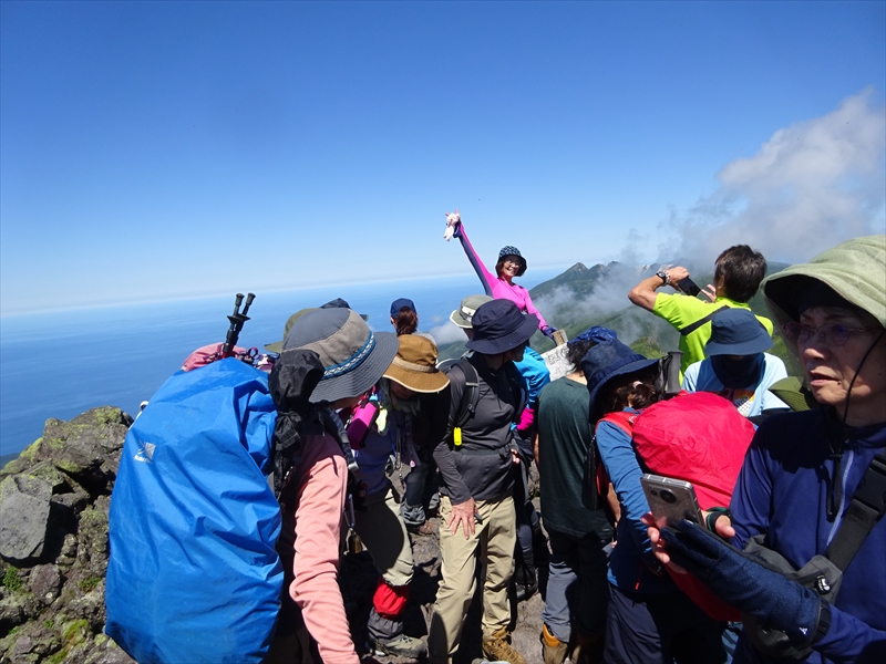 羅臼岳山頂で集合写真、快晴の天気で全方位遠くまで見渡せました。