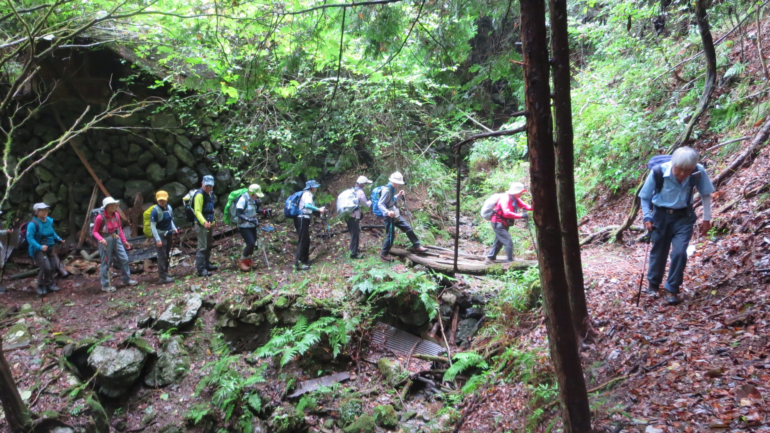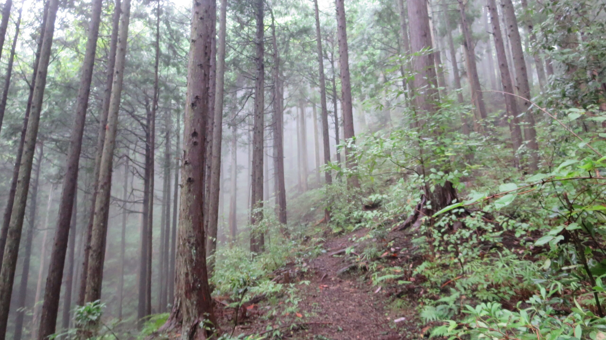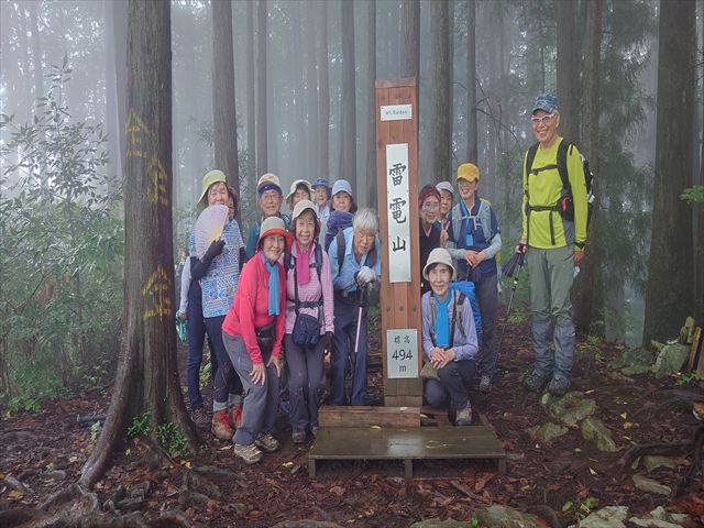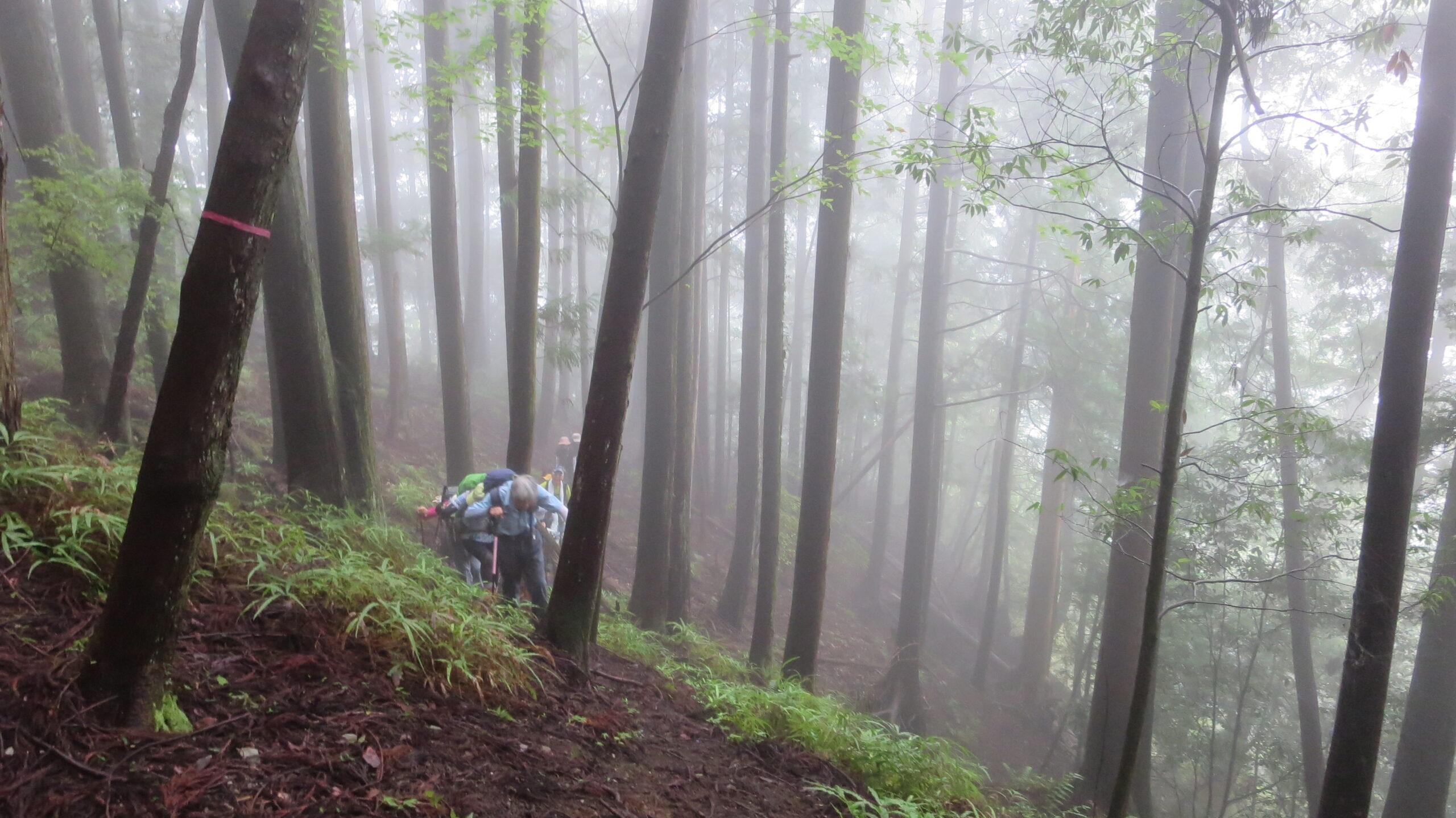 リーダーコメント:朝、霧雨が降っていた。今日の天気を心配しながら駅へ向かう。空は重い灰色。この様な天気でも参加者に感謝しながら軍畑駅を出発。朝方の山の沢沿いの低地は熊等いないとは断言できないので鈴を鳴らしながら平溝橋から入る。かつては人家があったと思われる地を過ぎると尾根道の急登がはじまる。しっかり水を含んだ道は滑りやすい。一人の外人男性が軽装で追い越して行った。