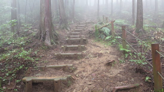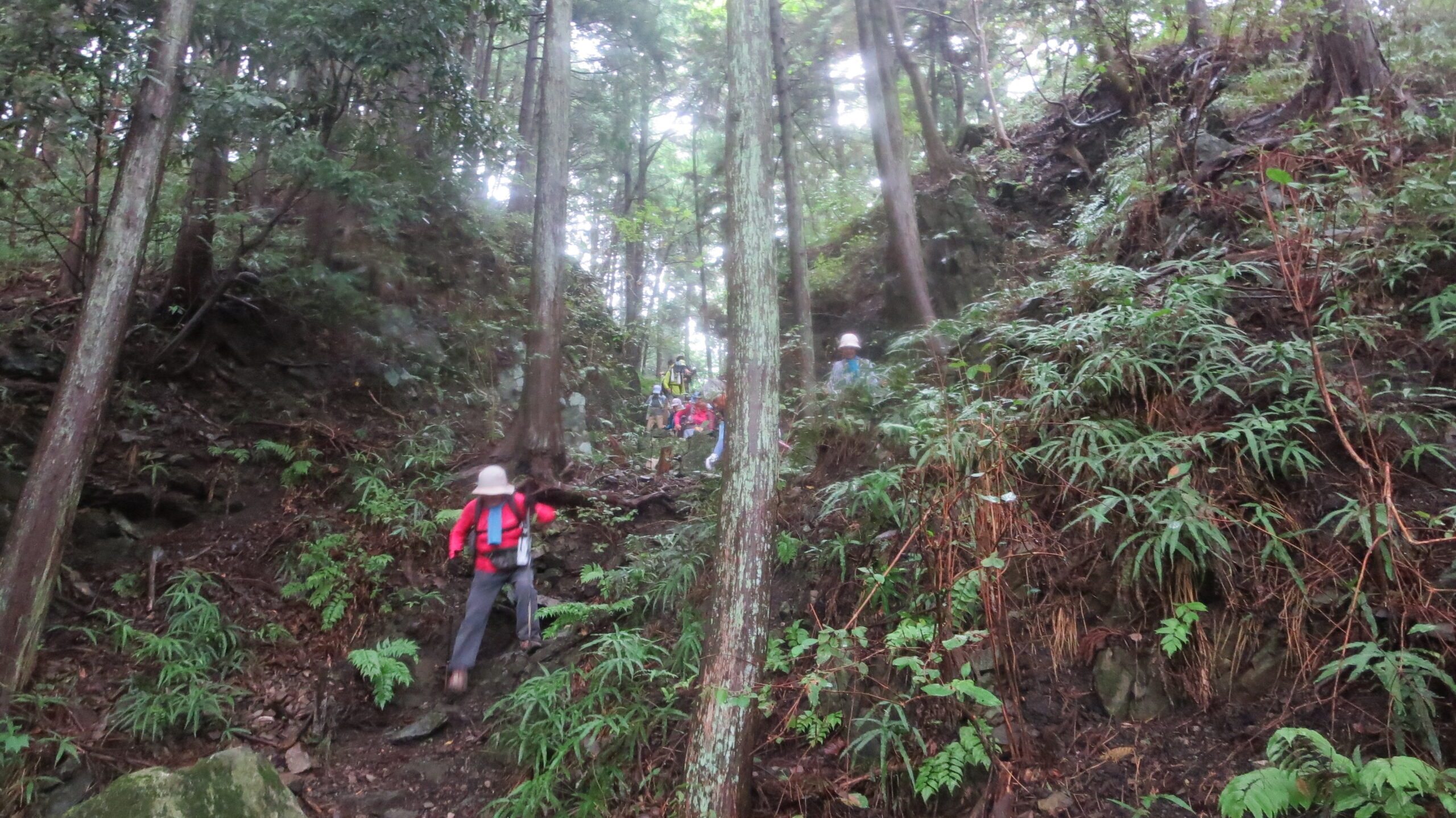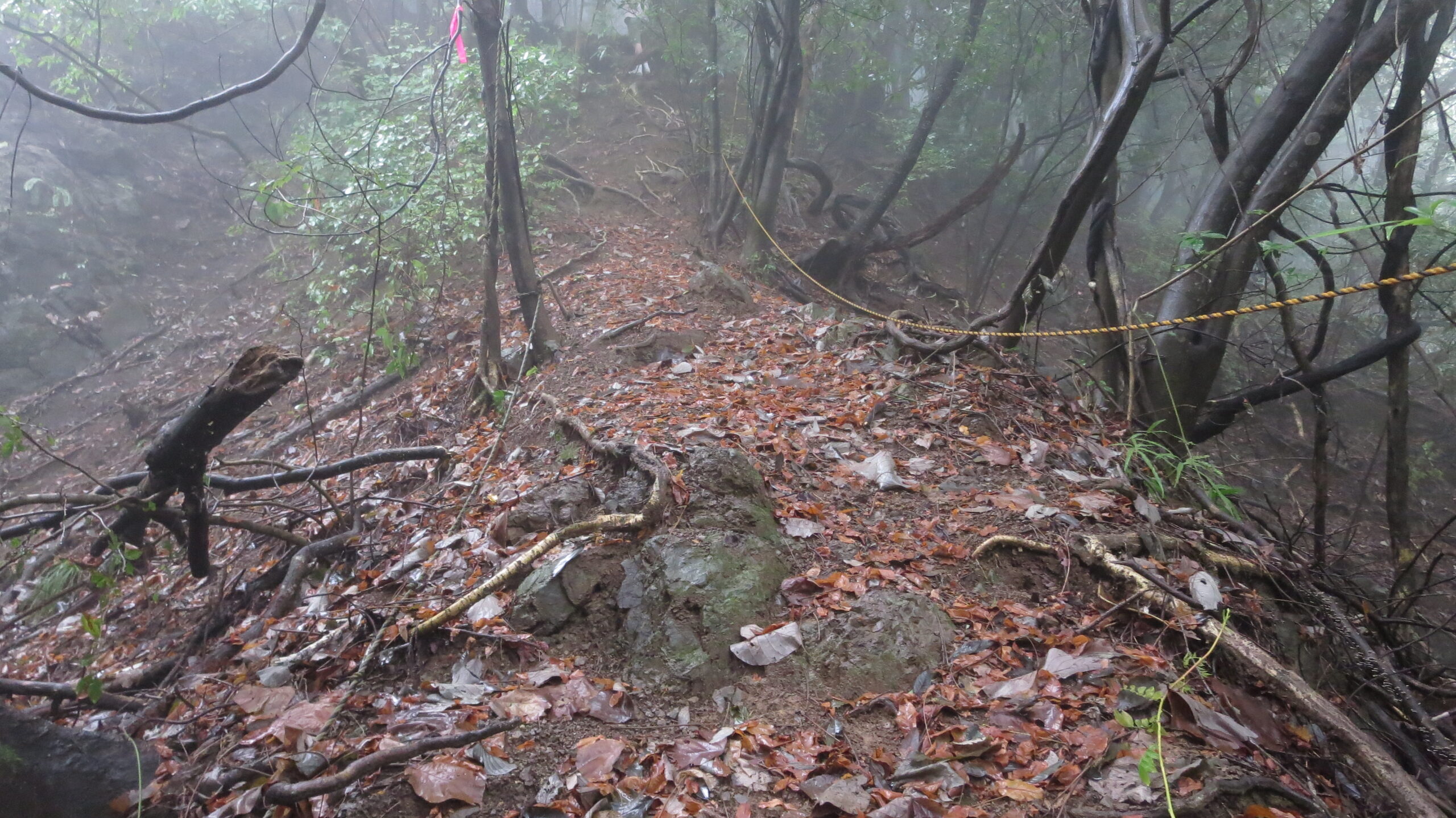 上りコース最大の難所。滑りやすい足元に注意してトラロープ沿いに慎重に上る。