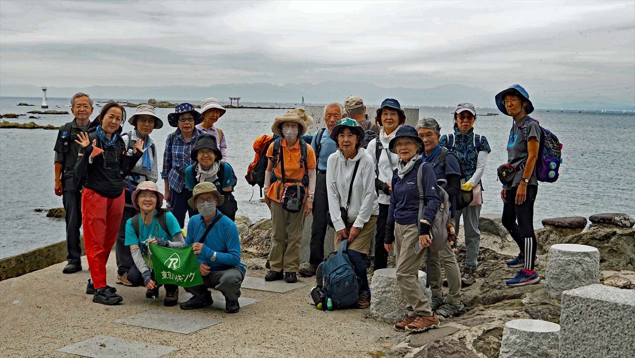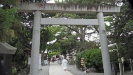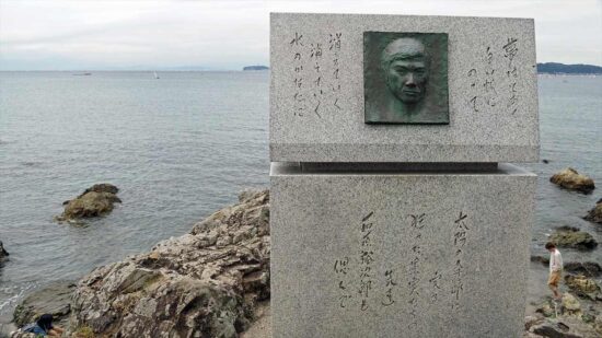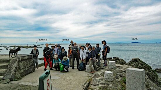 出発点の逗子駅 暑さもいち段落したせいか電車が着くたび次々と改札から人の波 バスも混みあうので着いた順番に先に乗ってもらう 駅前から海岸回りのバスに乗って 森戸神社で下車。裕次郎主役の映画「太陽の季節」リリーフから前方を見ると、赤い鳥居と白い裕次郎灯台、その右に江ノ島がくっきり見える。晴れていれば、その後方に富士山がどっしりと聳えている。境内には安産子宝の水天宮が祭られおり子宝の石(子生み石)がいくつも供えてある,