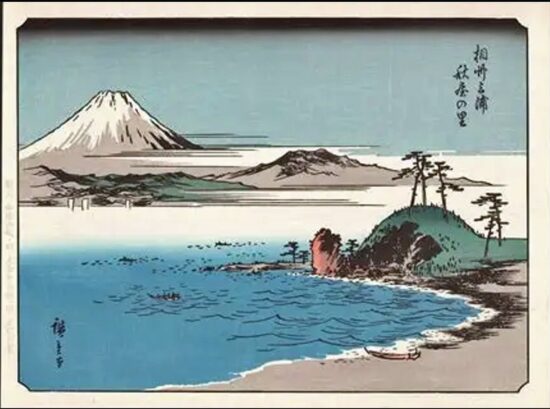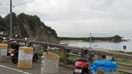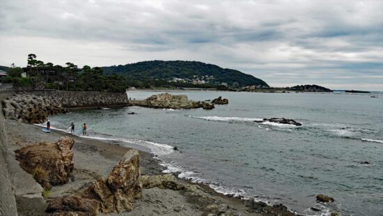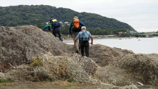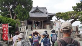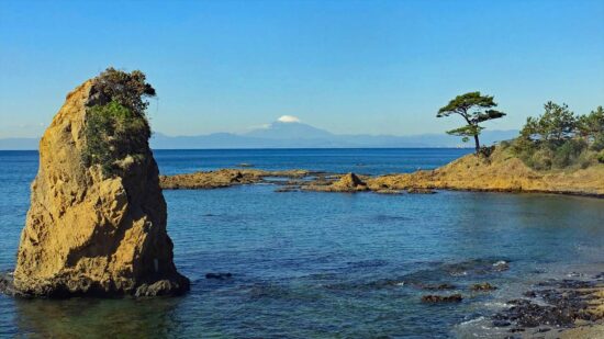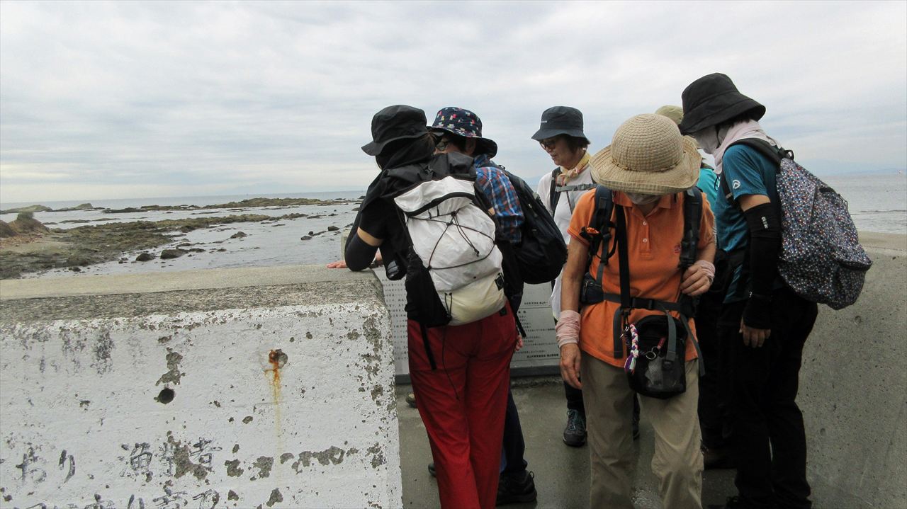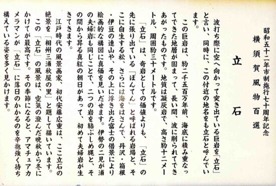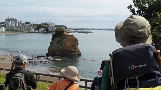 道路に戻り御用邸の正面を通り、長者ガ崎を見ながら歩き、熊野神社を左に見て「子産石」に着く。直経1メートル大の石が置かれていて周りには丸い小さな石が置かれ当時が偲ばれる。 円乗院で休憩して久留和(くるわ)魚港、立石不動尊、そして秋谷海岸と波打ち際に突き出した高さ12m、周囲約30mの巨岩「秋谷の立石」江戸時代の絵師歌川広重は「相州三浦秋屋の里」と題して富士山を遠くに見る、このあたりの風景を描いている。立石公園で休憩する。