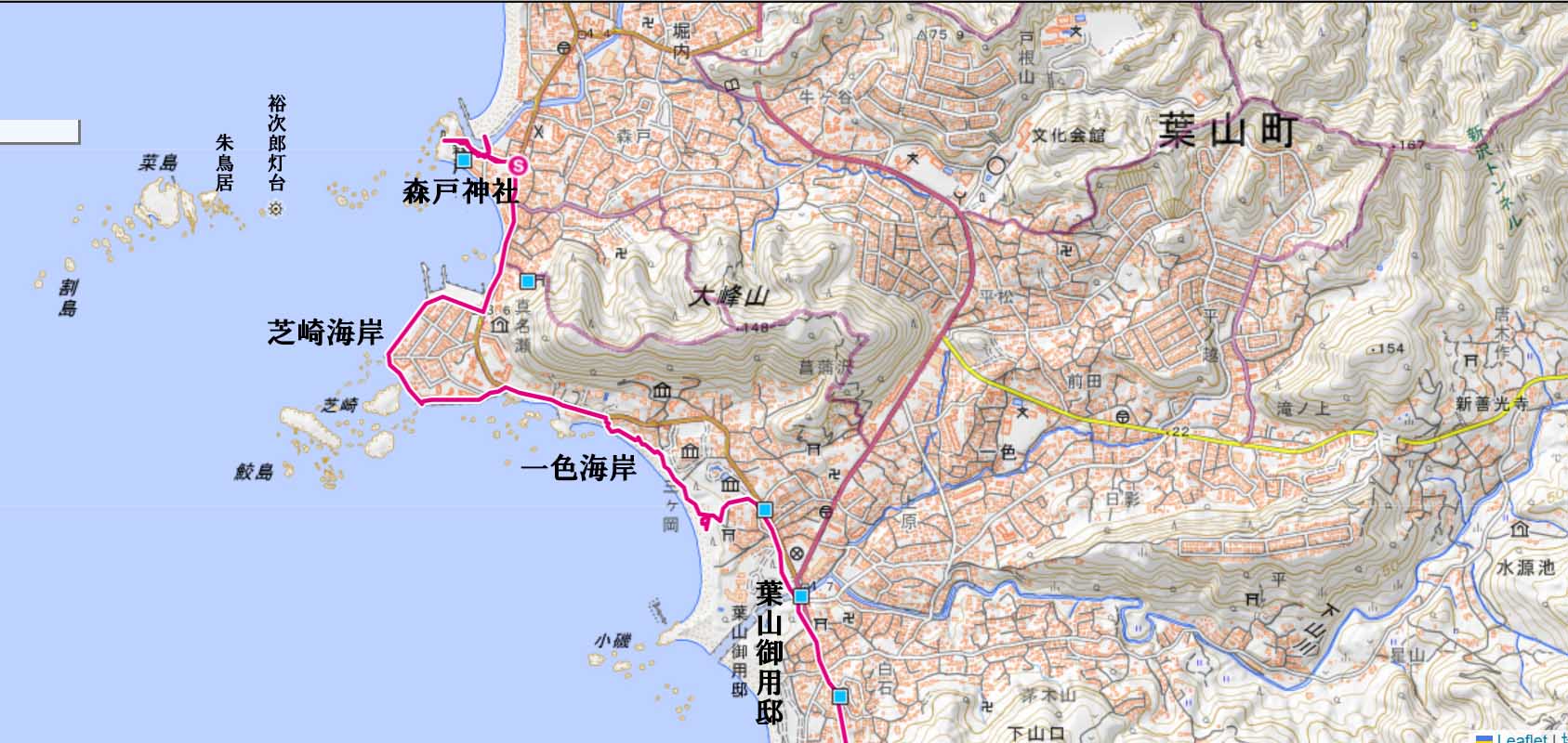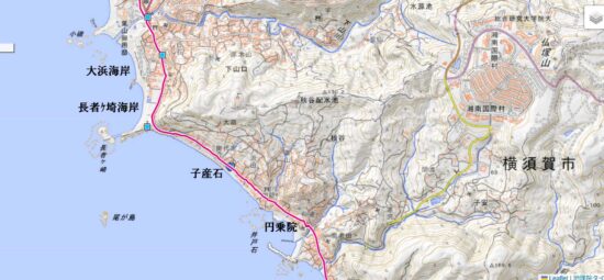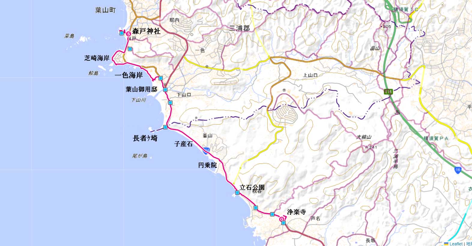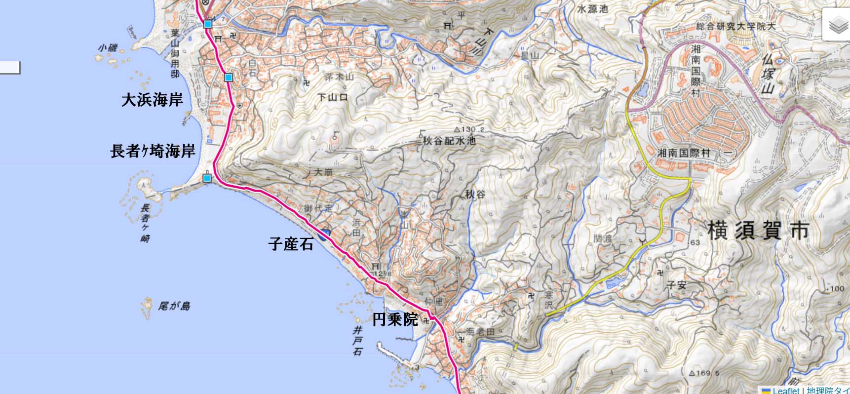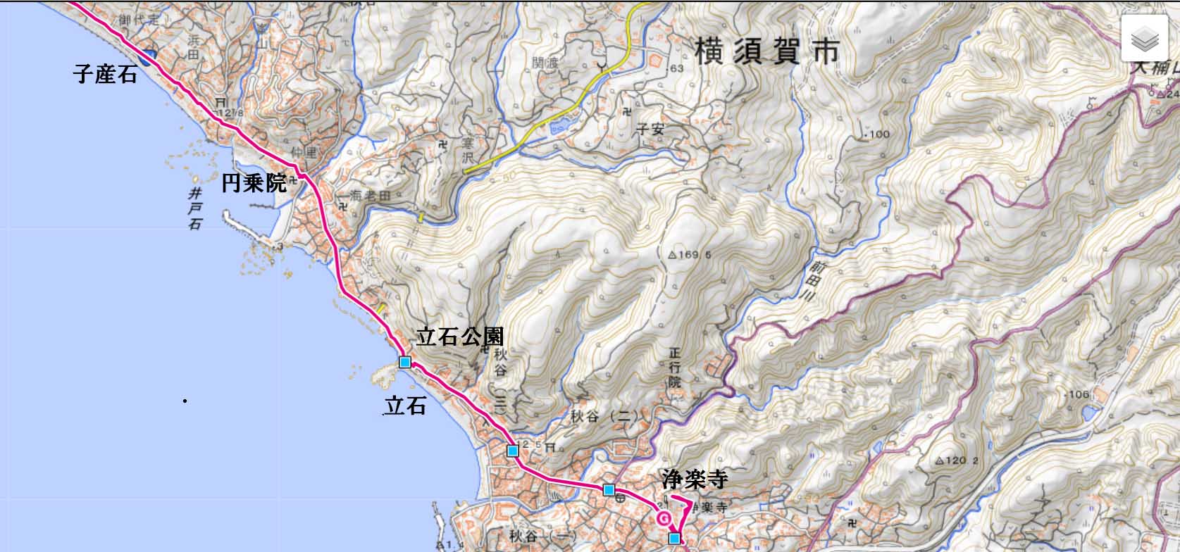 JR横須賀線逗子駅=森戸神社バス停10:29→10:41森戸神社11:03→11:41一色海岸(昼食)12:25→12:36御用邸前→12:50長者ヶ埼→子産石13:07→円乗院13:20→13:37立石→14:10浄楽寺→14:24浄楽寺バス停=逗子駅