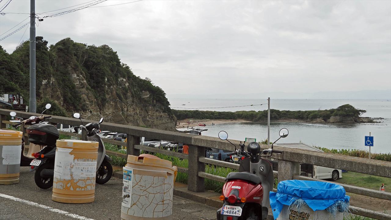 立石公園 先端は梵天の鼻 人がいる。この裏側に「秋谷の立石」がぽつんと・・