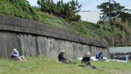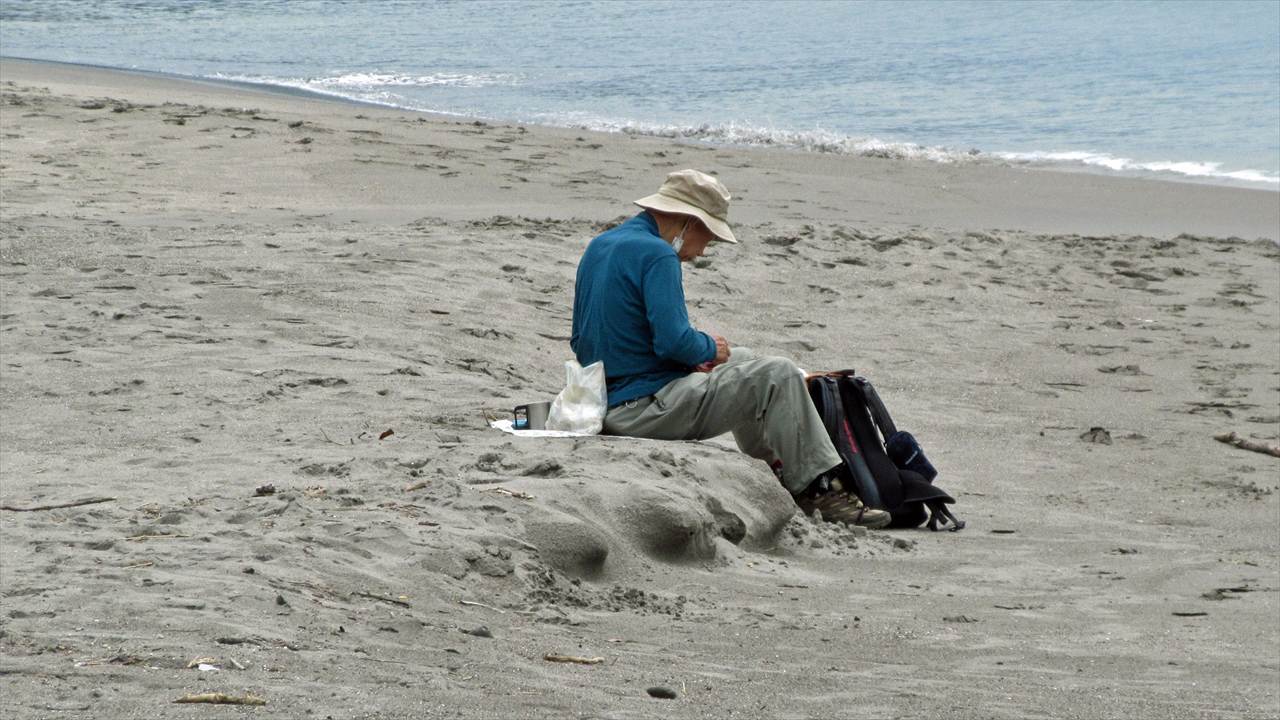 海沿いの道をしばらく歩き、近代美術館の手前から砂浜に下りて、一色海岸で海を見ながら昼食。