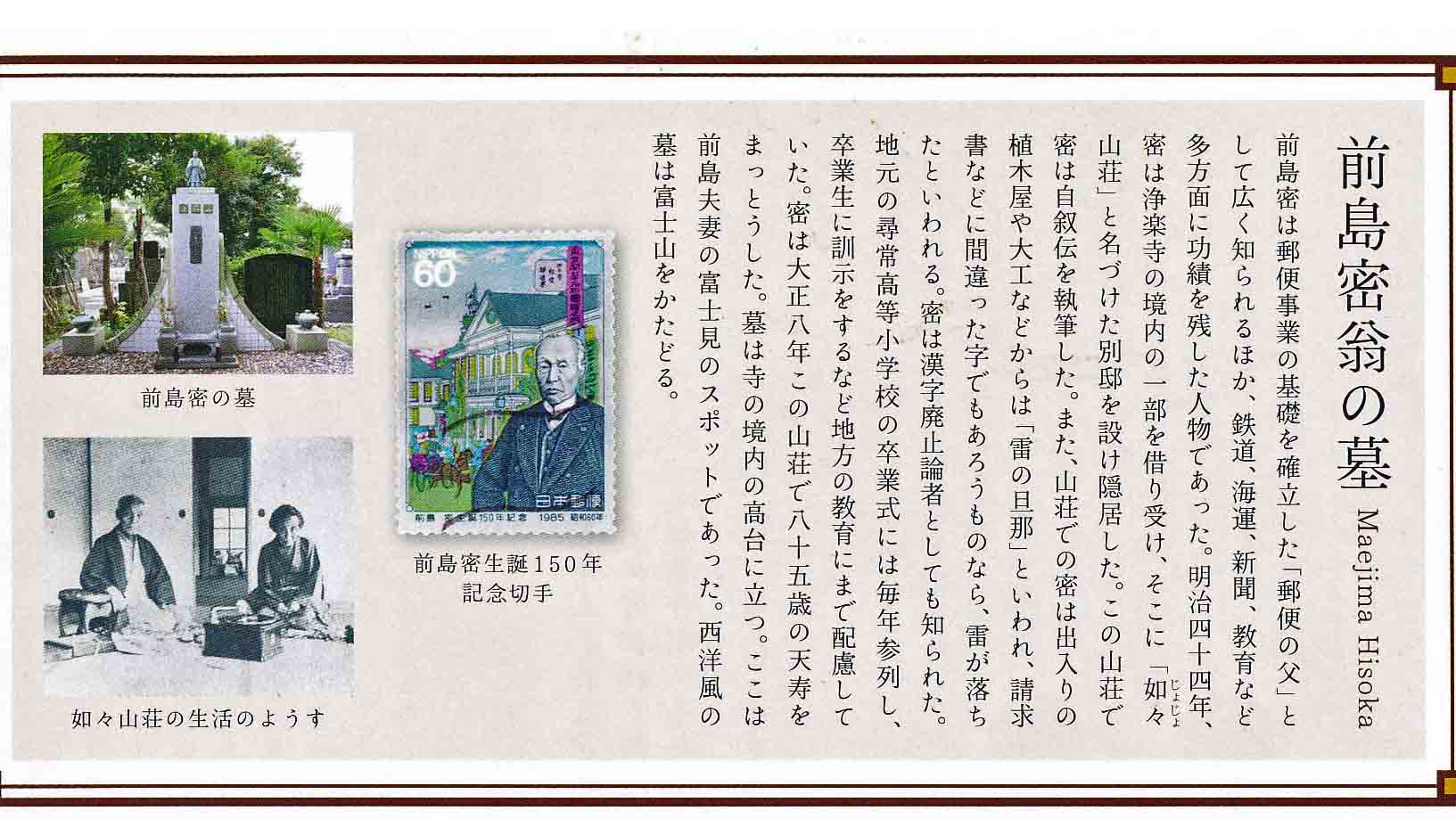 しばらく歩くと浄楽寺。境内には、「郵便の父」言われる前島密夫妻の墓と阿弥陀堂には運慶作の仏像がある。中嶋 要一