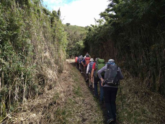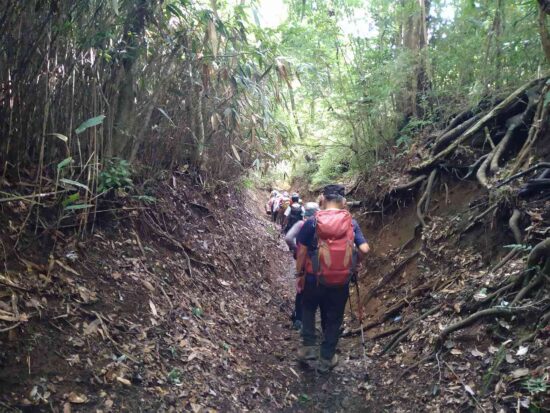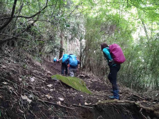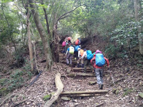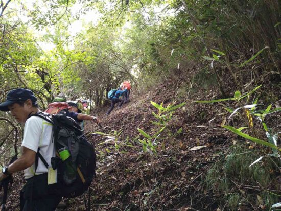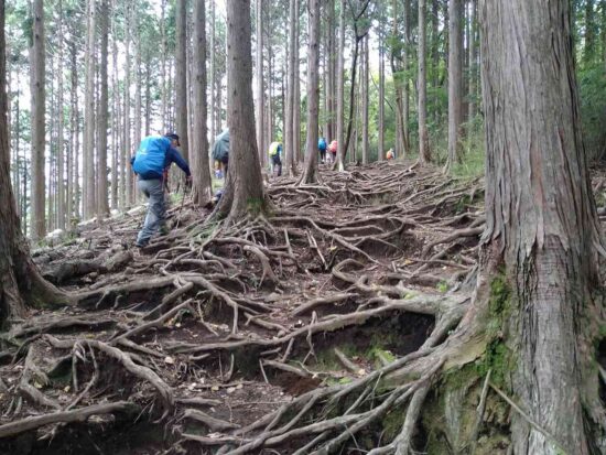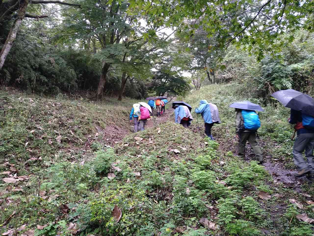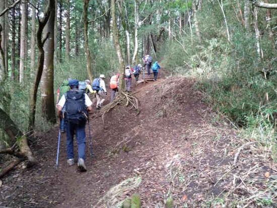 一週間前の宿の解約料発生時からずっと注目していた天気予報でしたが、結果は土が雨、日は晴となりました。土の雨の降り出しも早まり安全を考えて目的地へ向かう車中で山の変更を決断です。開放的な駒ケ岳より樹木が茂る湯坂路へ。のっけからの雨具着用でしたが、みんなのいつもと変わらぬ笑顔の対応と歩くさまに感謝して、宿まで歩きました。