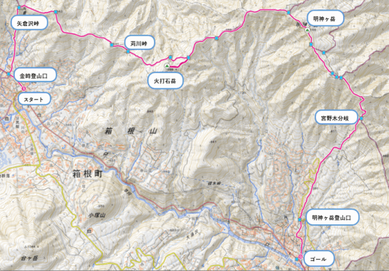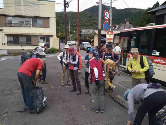5日 : 宿9:30→大平台駅=仙石9:30→矢倉沢峠10:25→火打石岳分岐11:54→火打石岳12:10→(戻る)→火打石岳分岐12:25/12:55(昼食)→明神ヶ岳13:45→宮城野営業所前バス停15:45=箱根湯本駅