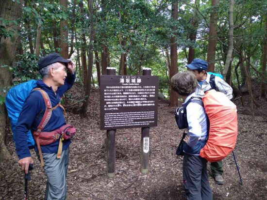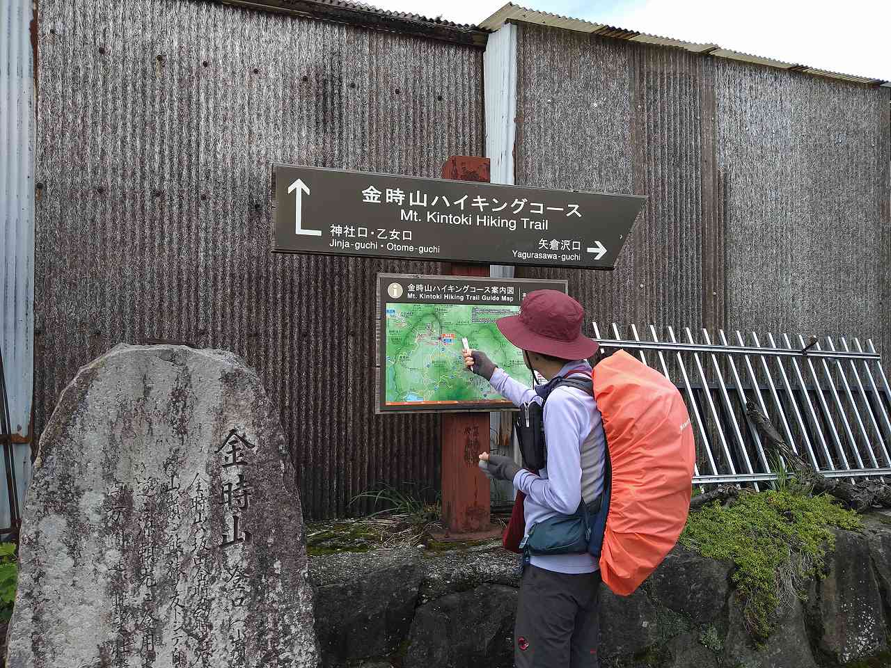 仙石バス停からすぐの登山口で、リーダーが地図と標識の確認をしています