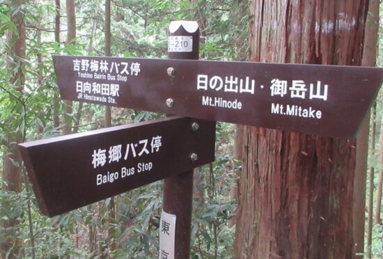コース:御嶽駅 9:40集合 歩行開始 9:55 → ラニヘッドトレイル → 高峰 (昼食) 11:25-11:55 → 要害山 12:30 → 三室山 12:50 → 琴平神社 13:20 → 菅原神社 14:15→ JA直売所 解散 → 日向和田駅 14:30