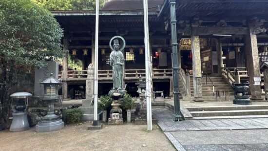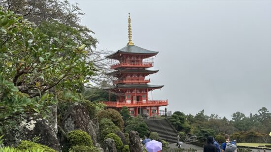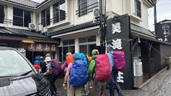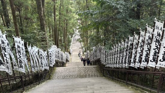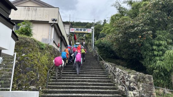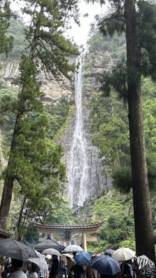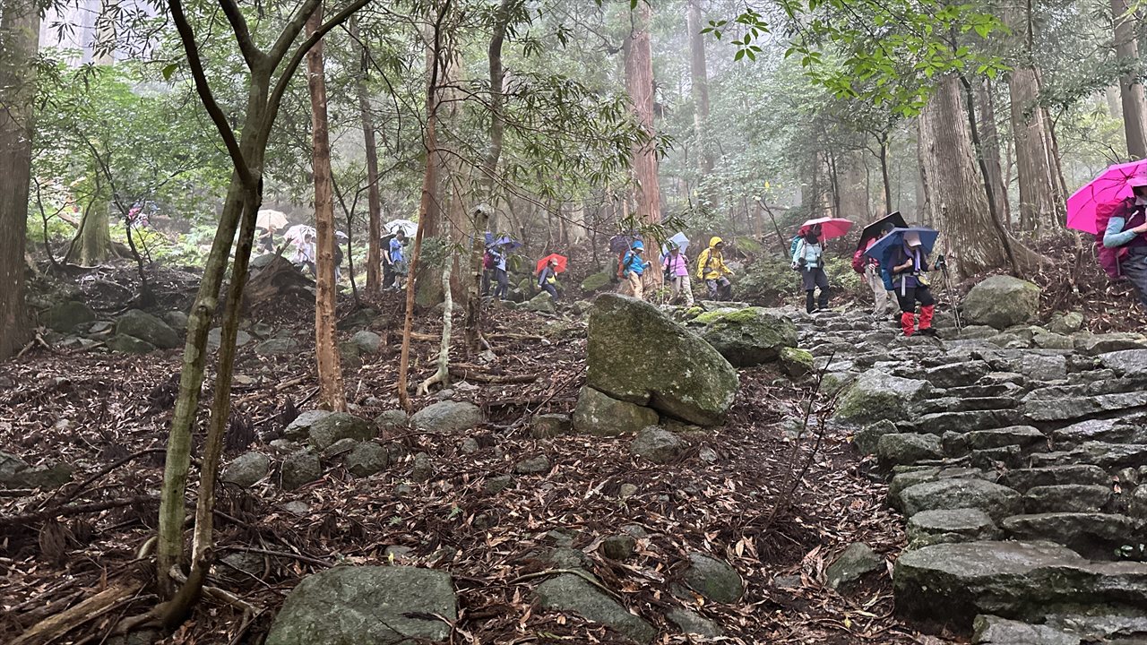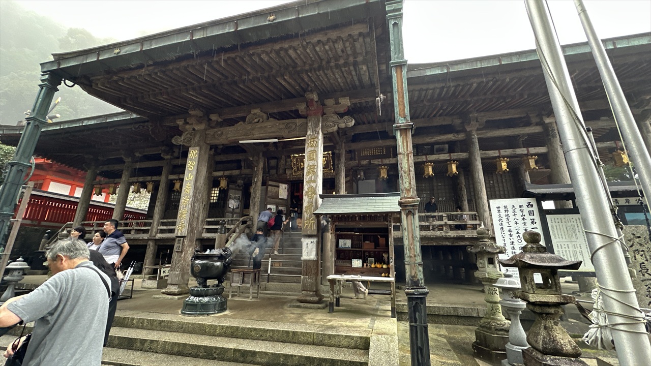 初日は、那智駅から大門坂を経て熊野那智大社、那智山青岸渡寺、そして那智の滝を巡りながら、お宿まで歩く予定でしたが、あいにくの雨に見舞われたため、那智駅から那智山まではバスでの移動に変更しました。それでも、霧に包まれた山道や雨に濡れた石畳はしっとりとした風情があり、熊野らしい神秘的な雰囲気を味わうことができました。古道を歩いていると、すれ違う方のほとんどが外国の方で、日本人はわずかに2~3人ほど。改めて、熊野古道が世界的にも人気のある巡礼の道であることを実感しました。