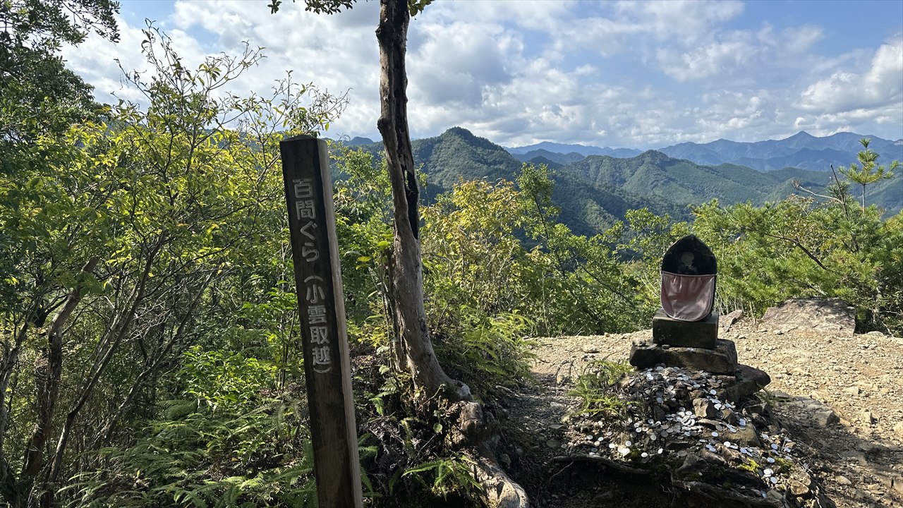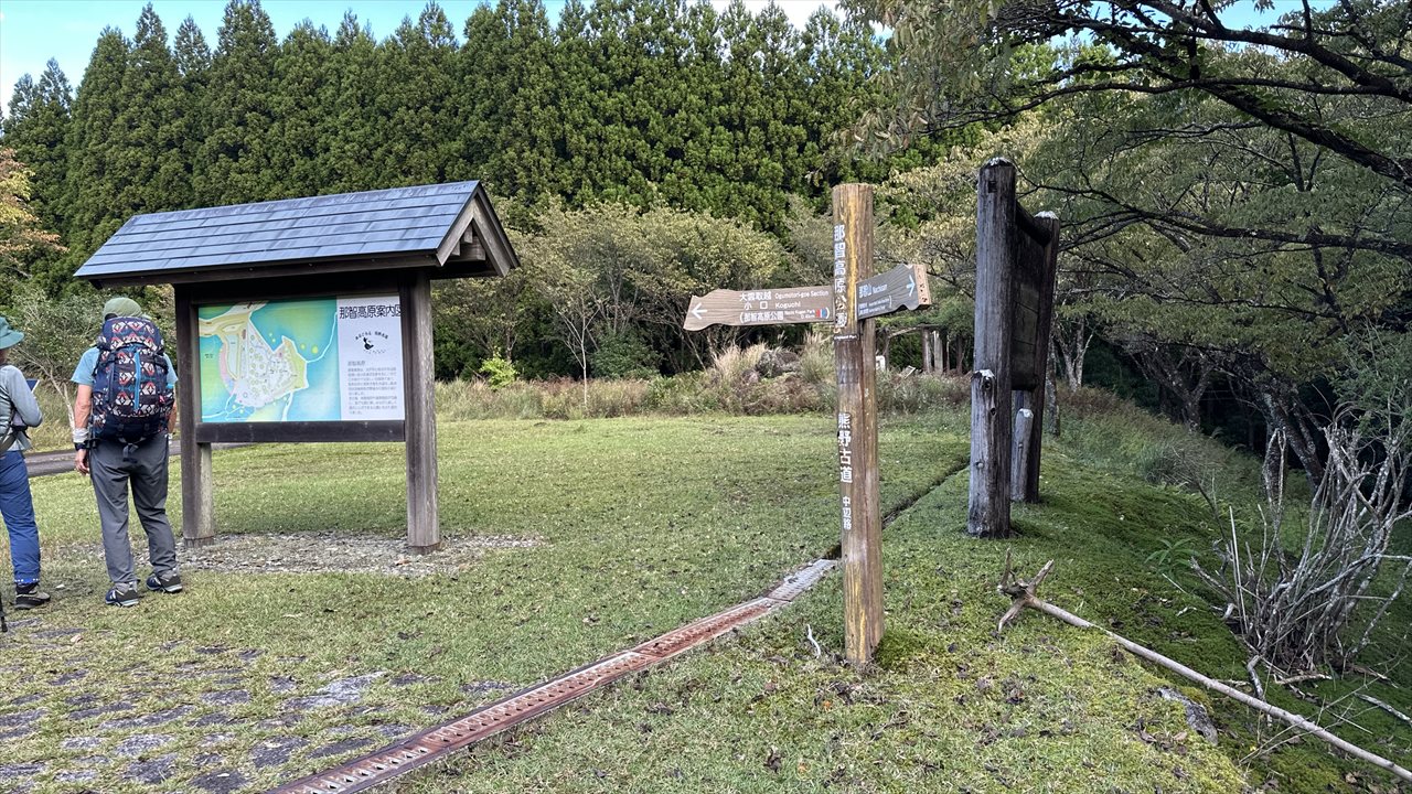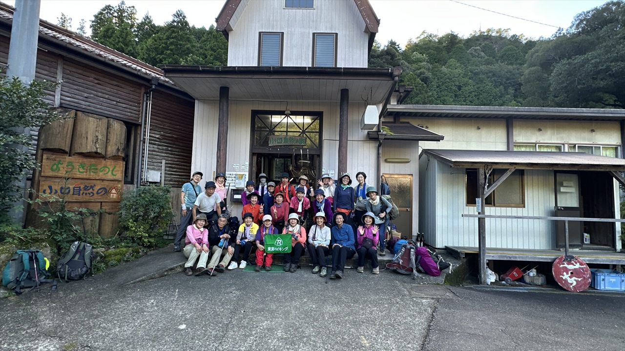 – <13日(月)>〔宿〕06:30→6:48那智山・青岸渡寺→7:39那智高原公園 →8:28登立茶屋跡→ 9:30 舟見茶屋跡 →10:02色川辻(昼食) →11:30 地蔵茶屋跡→13:05 越前峠→ 14:3 楠の久保旅籠跡→15:13 円座石→16:00 小口自然の家(1泊)