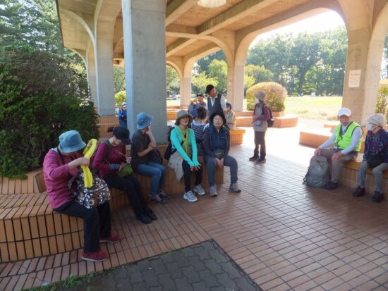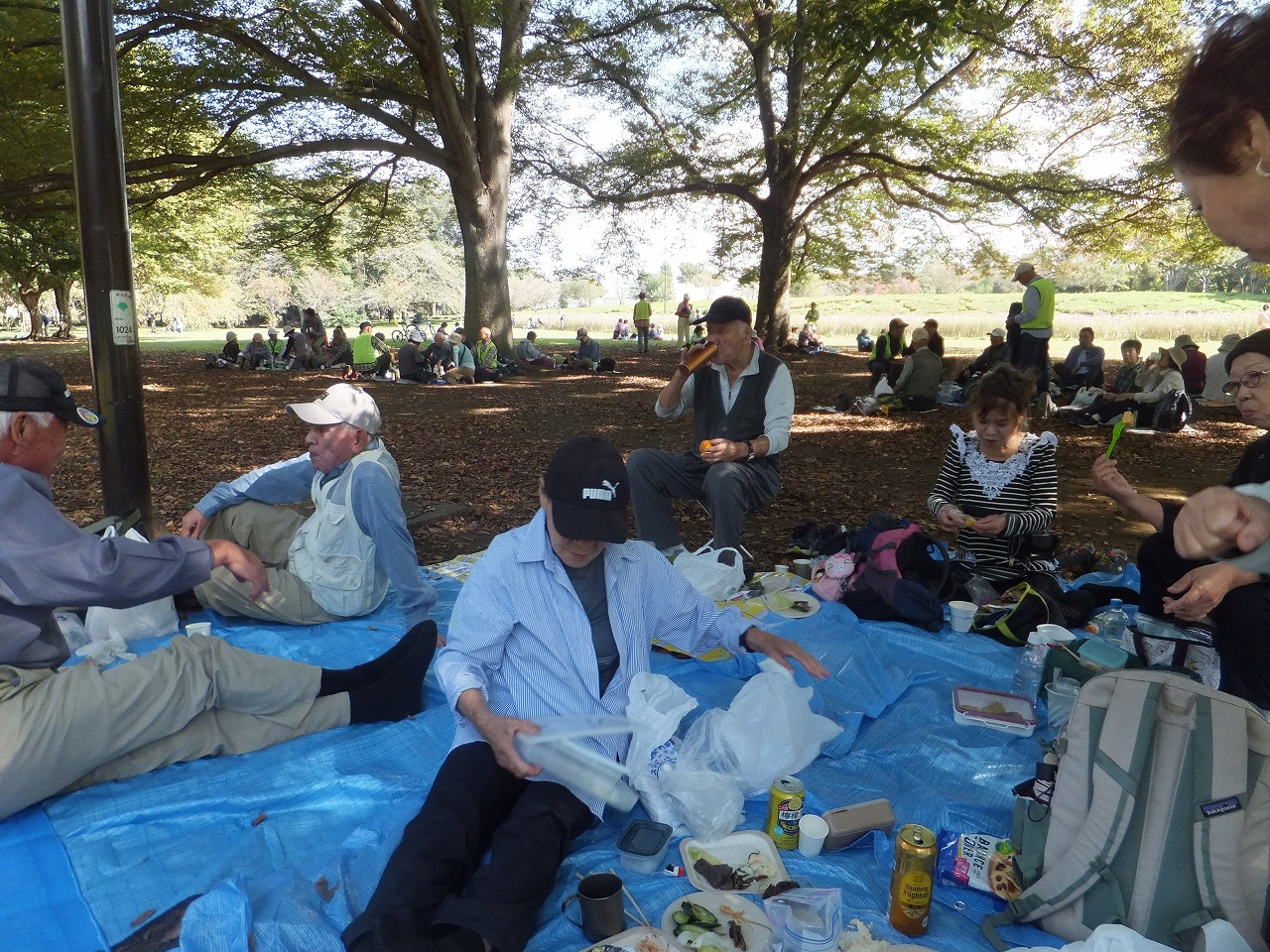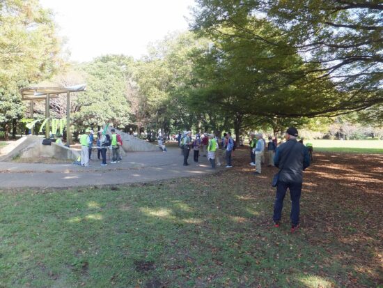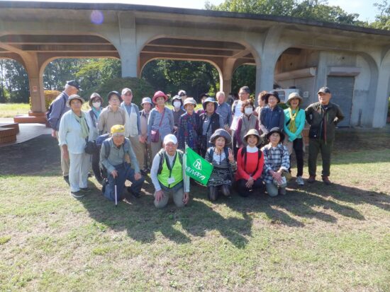 販売機のある休憩所での集合写真 2025年10月18日〔土) 天気:晴れ レベル:ウォーキング① 担当L:柴崎実 協力L:中嶋要一、柳田邦之、岩間英之(投稿) 参加者:32名(男:13人、女:19名) コ-ス:武蔵小金井駅北口9時00分集合→-小金井街道→小金井公園西口→販売機のある休憩所→江戸東京たてもの園(通過)→つつじ山広場(東ハイ祭会場) 担当Lの朝の挨 ・ つつじ山広場東ハイ会場に到着