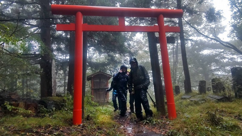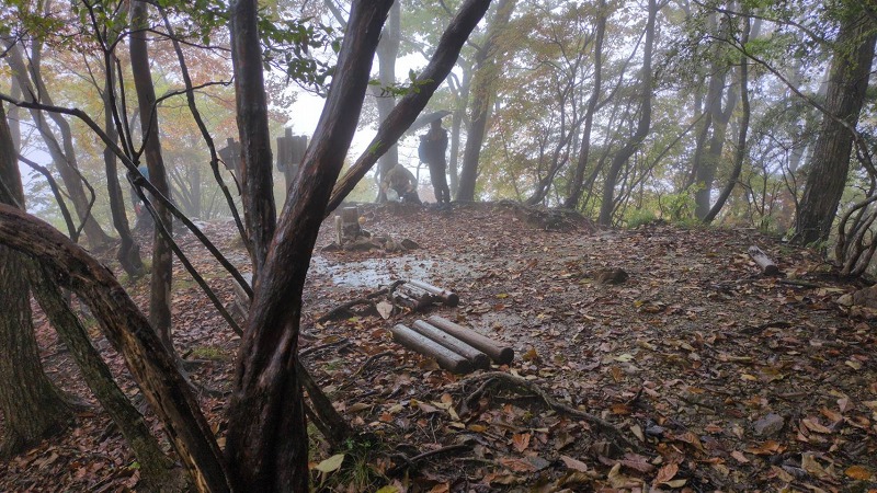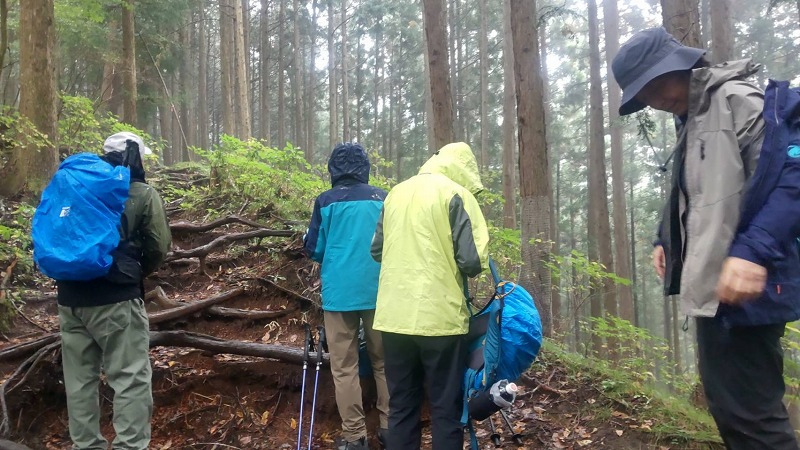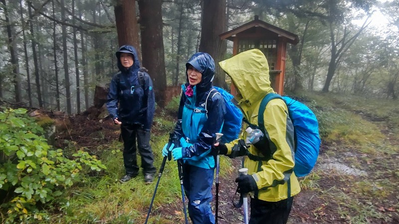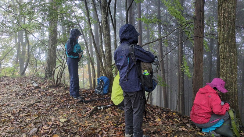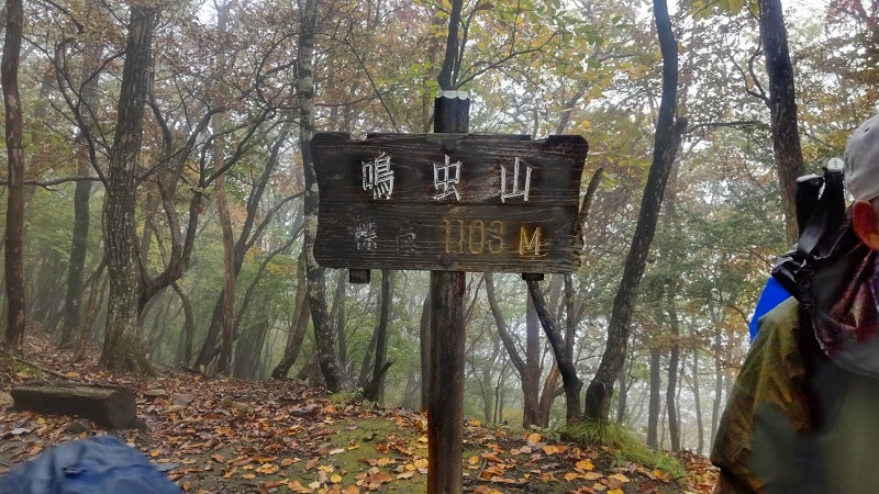 何とか鳴虫山の山頂に到着しました。ここで雨の山行を中止しました。ずっと雨の中です。