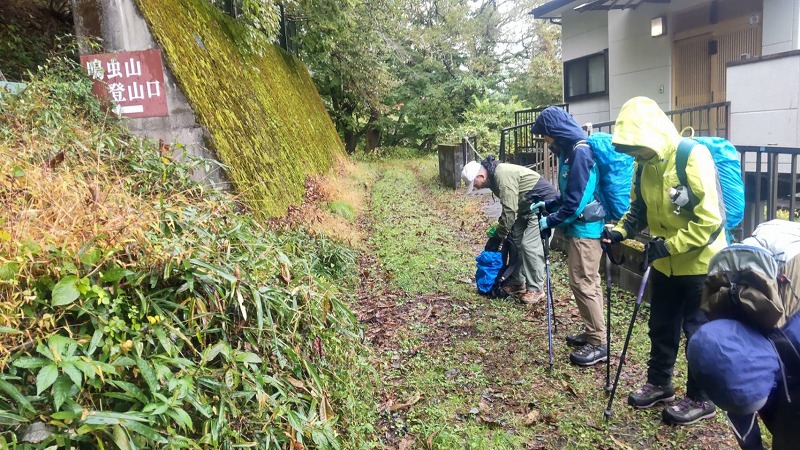 日光は何とか曇るという淡い期待に反して、着いたら本降りの雨。どうしようかという判断をしていたら、4名が到着しました。そこで一応鳴虫山まで行って、判断することにして出発しました。