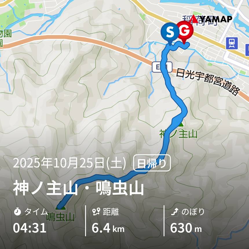 ▼コース :東武日光駅9時35分出発→9時49分鳴虫山登山口→10時26分神ノ主山→11時46分鳴虫山山頂「下山」→13時32分神ノ主山→14時17分鳴虫山下山口→14時21分公園口