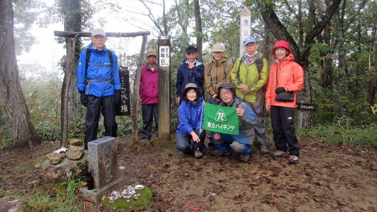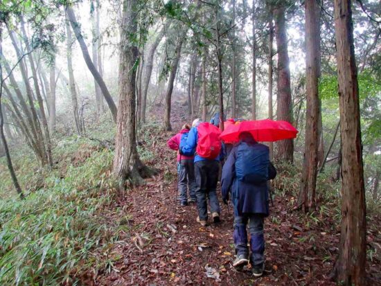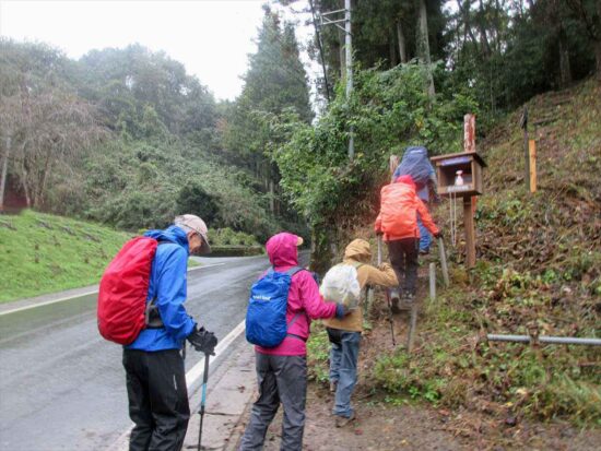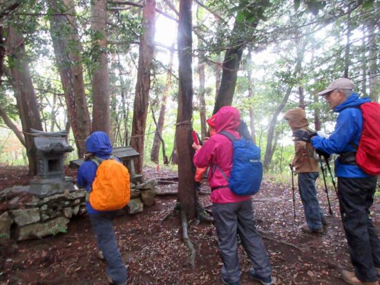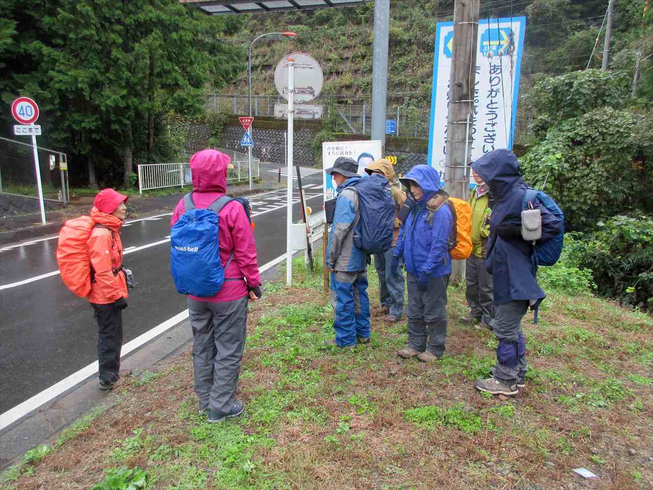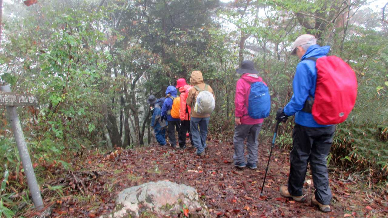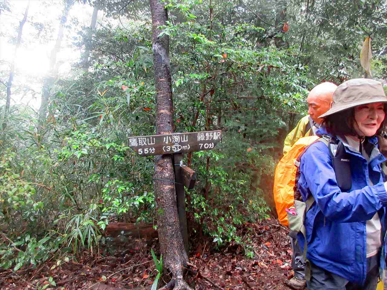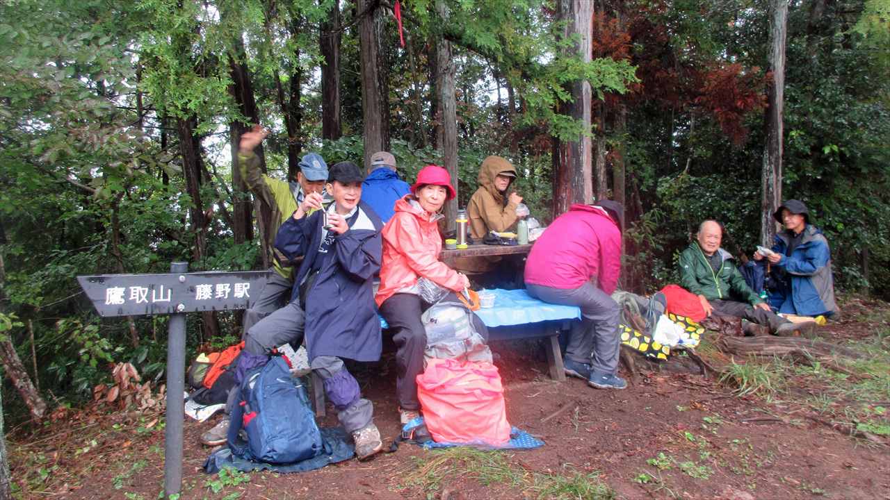 集合場所で、参加者が少なければ中止にしようと思ってましたが、10名程度の人が集まっており予定通り決行することにしました。上野原駅からバスに乗り澤井入口で下車し、小雨のなか鷹取山の頂上に着く。 曇り時々小雨のなか小渕山、岩戸山から藤野駅迄縦走しました。このような天気のなか、ご参加有り難うございました。中嶋要一