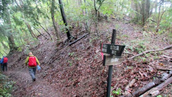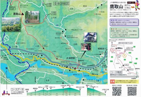 JR中央本線上野原駅=沢井入口バス停9:16→9:35金毘羅山→鷹取山10:05→岩渕山11:15→12:10岩戸山(昼食)12:35→13:16藤野駅