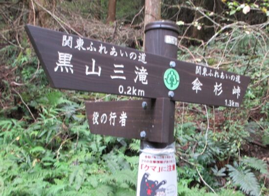 コース:越生駅 = 黒山バス停 歩行開始 10:00 → 黒山三滝 10:15 → 役行者(大平山) (昼食) 11:40-12:10 → 大峰山 12:40 → 傘杉峠 12:55 → 顔振峠 13:30 → 借宿神社 解散 → 吾野駅 14:50