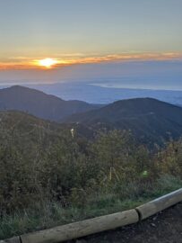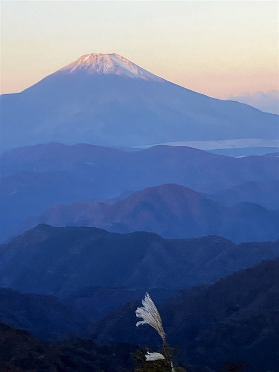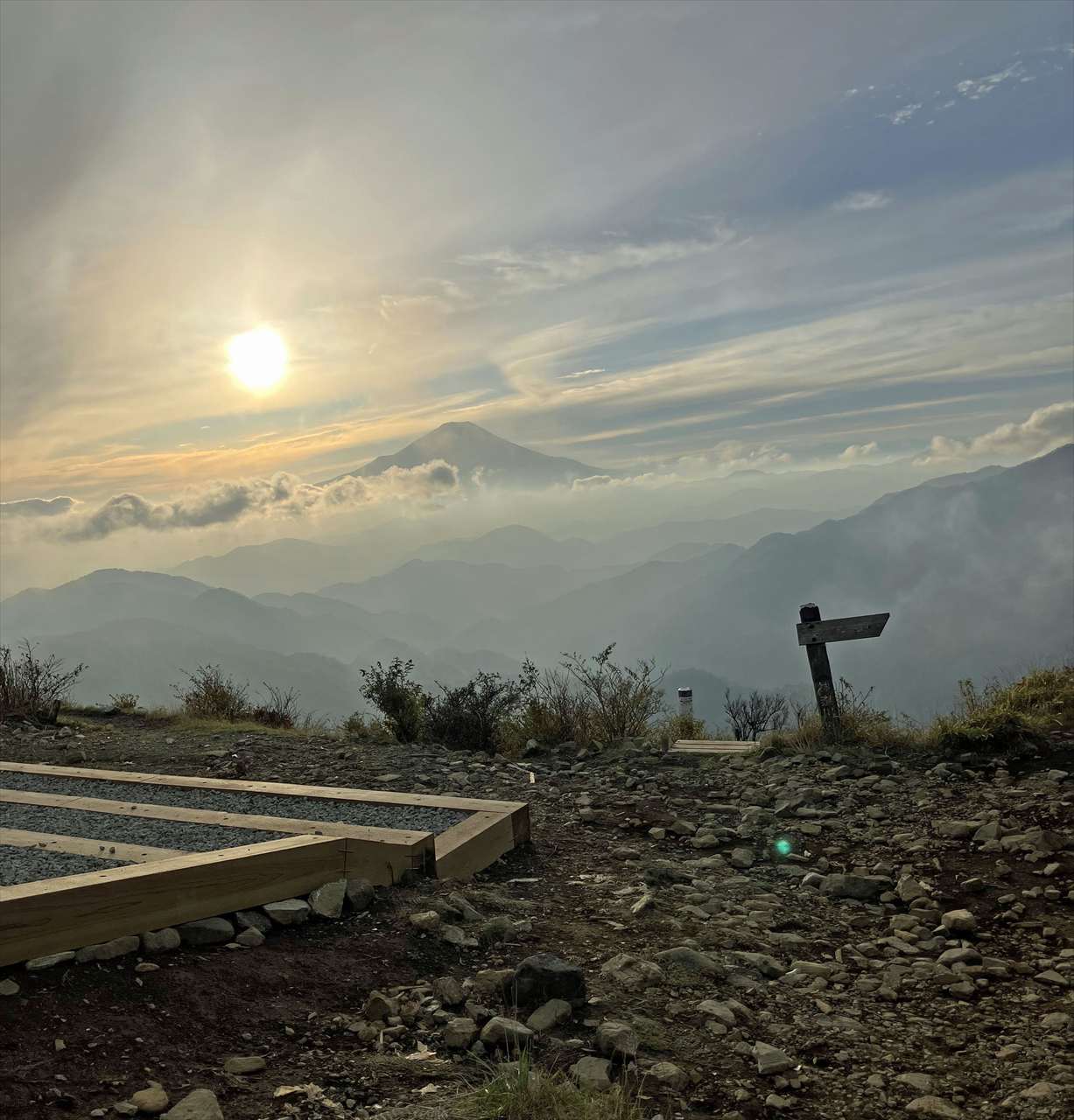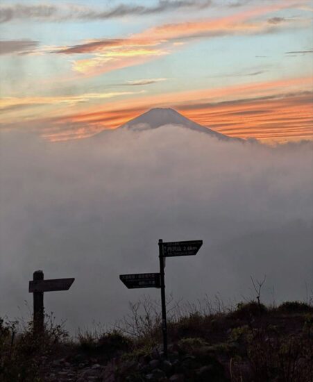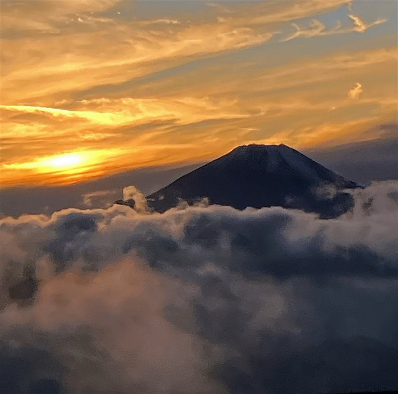 日の入り近くになって、霧がとれ富士山が顔を出してきた。(斉藤稜子さん撮影)
