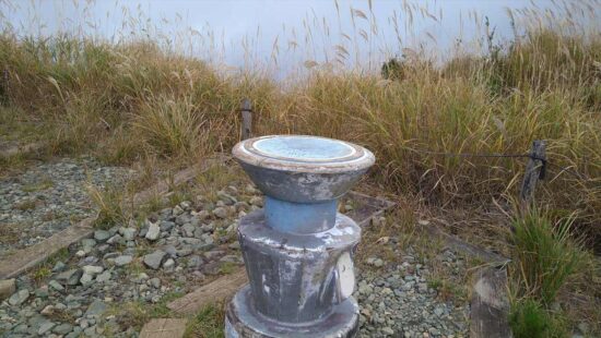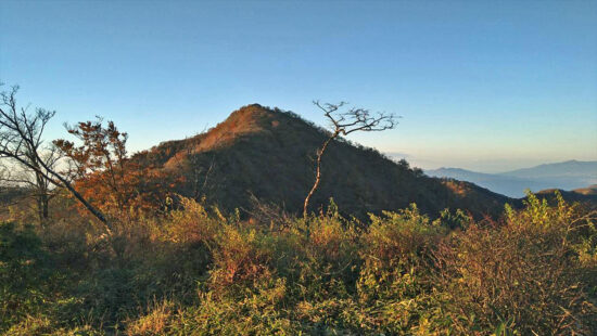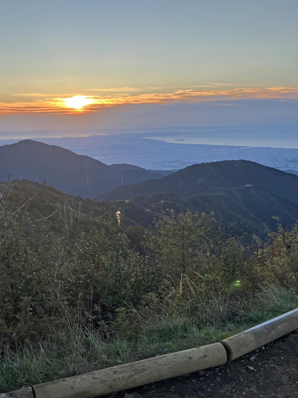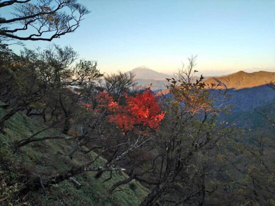 折り返し、塔ノ岳に戻ると朝日を浴びた駿河湾に伊豆大島がくっきりと見えた‼。
