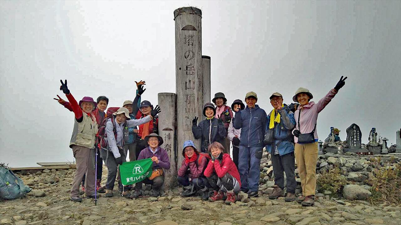 やったー! 塔ノ岳山頂で集合写真。曇っている 。1,491m