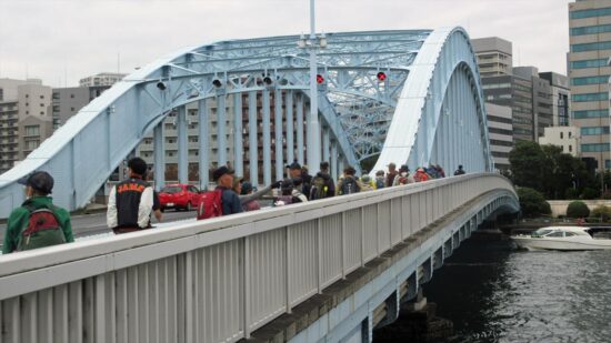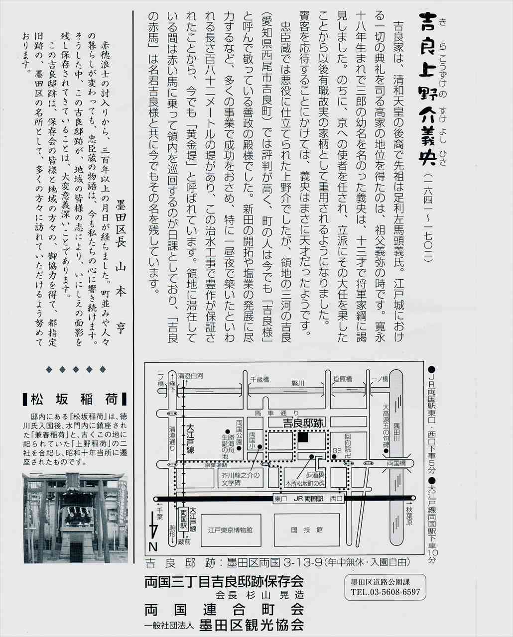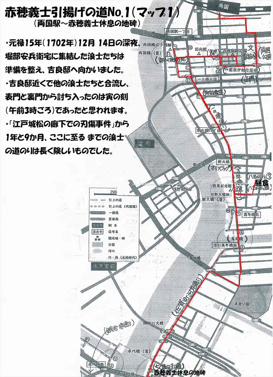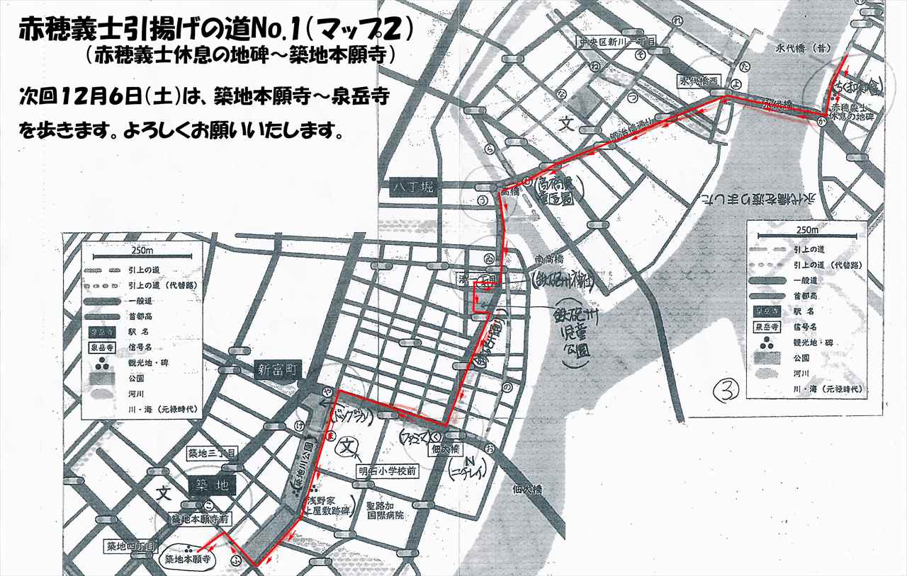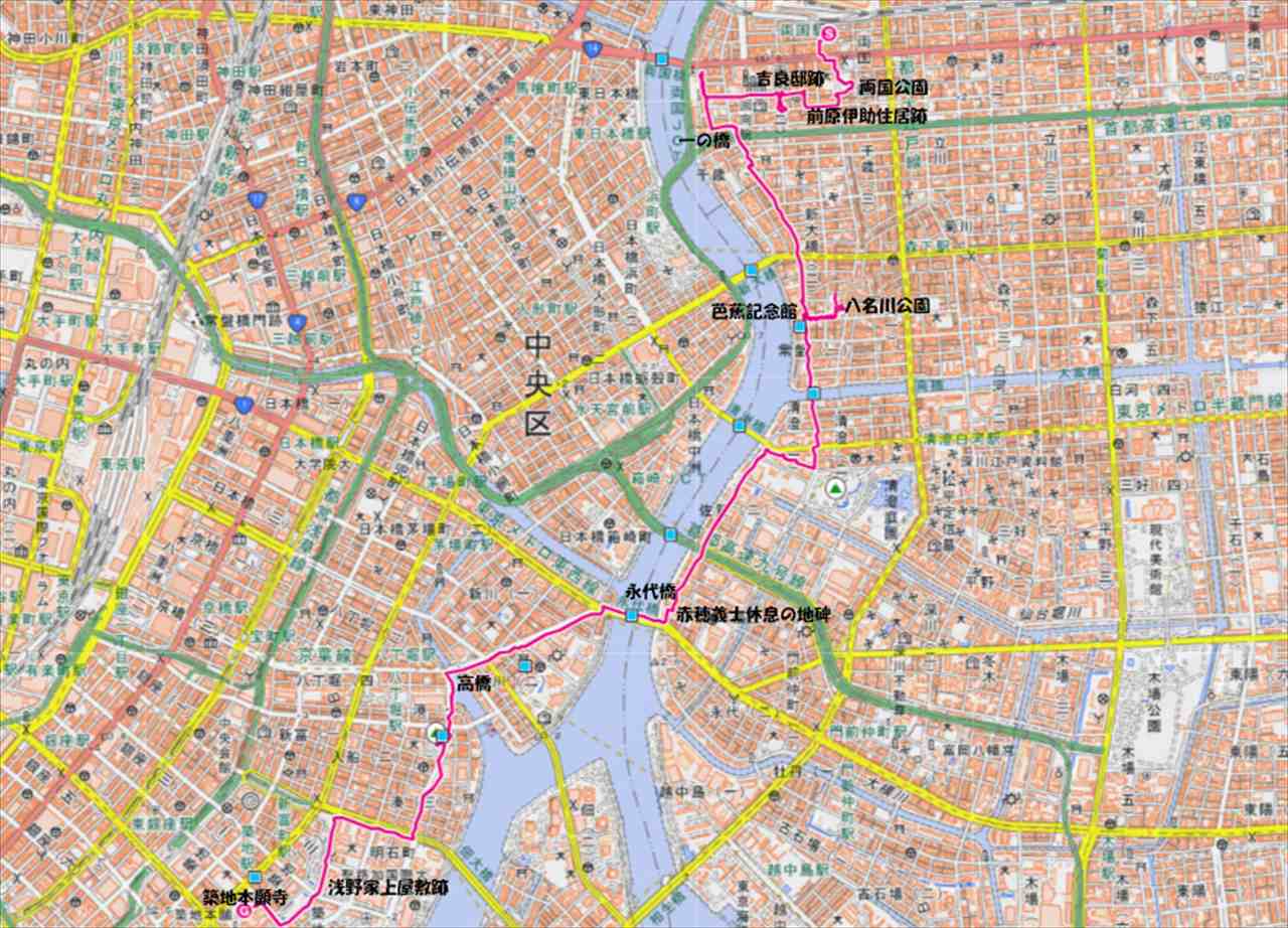 両国公園(勝海舟生誕の地)10:25→本所松坂公園(吉良邸跡公園)10:33→前原伊助住居跡10:38一之橋10:56→11:15八名川公園(昼食)11:55→赤穂義士休息の地碑(ちくま味噌前)→12:57鉄砲洲稲荷神社13:12→浅野家上屋敷跡碑13:30→13:40築地本願寺13:50(解散)→築地駅