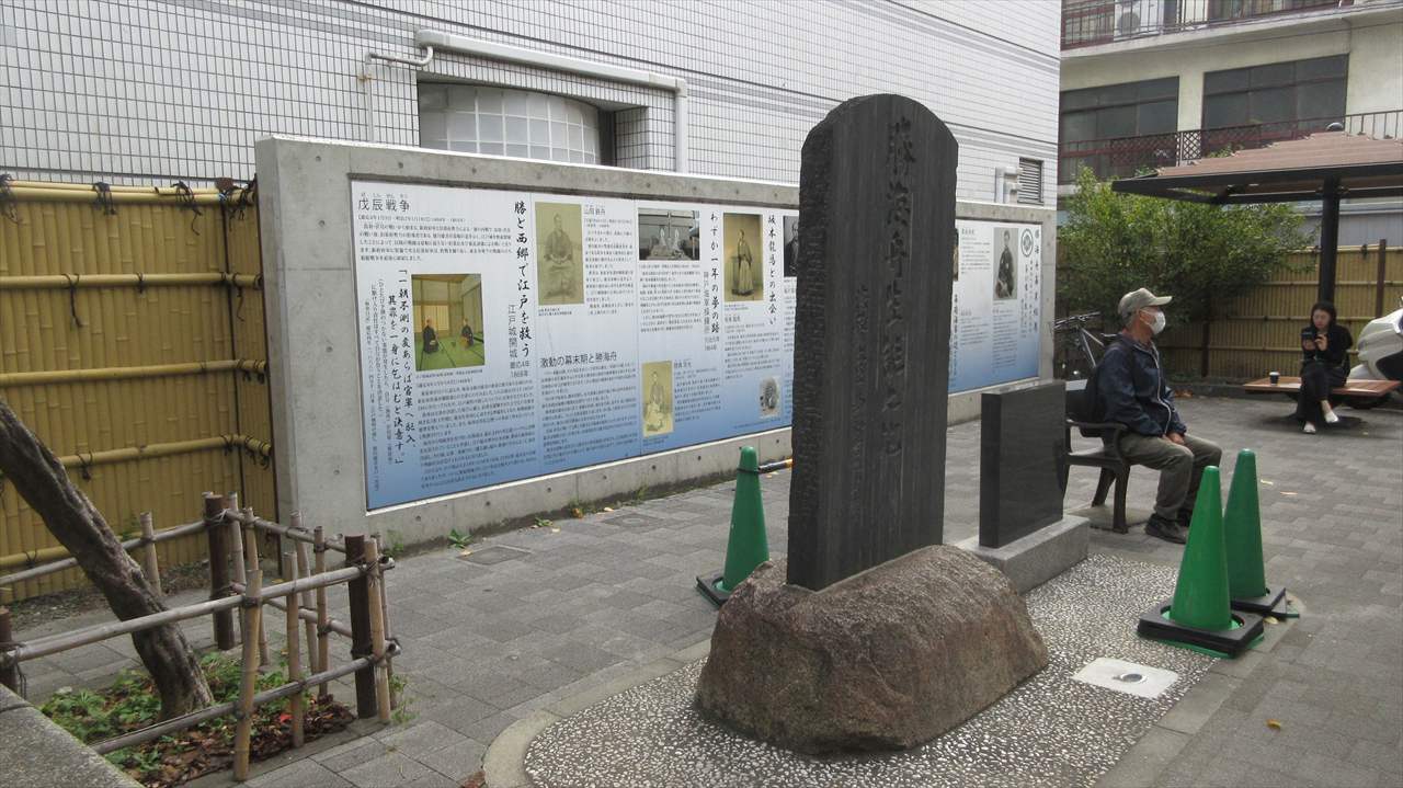 勝海舟は、文政6年(1823)1月30日、ここ本所亀沢の父小吉の実家である男谷家に生まれた。初めの名は義邦、幼名麟太郎。蘭学を修め、西洋の兵学、砲術、航海、測量法などを学び、安政7年(1860)1月、咸臨丸艦長として邦人の手による初の太平洋横断の快挙をなしとげた。慶応4年(1868)3月、高輪の薩摩藩邸において西郷隆盛と会見し、江戸城無血開城に成功し、江戸市民を戦禍から救った。明治政府にも重用され、参謀兼海軍卿・元老院議官などになり伯爵となった。