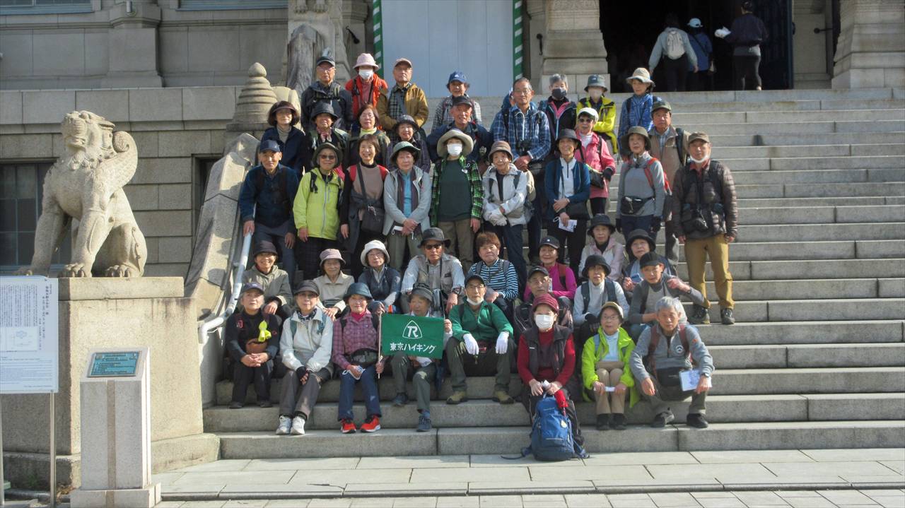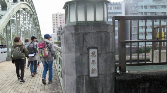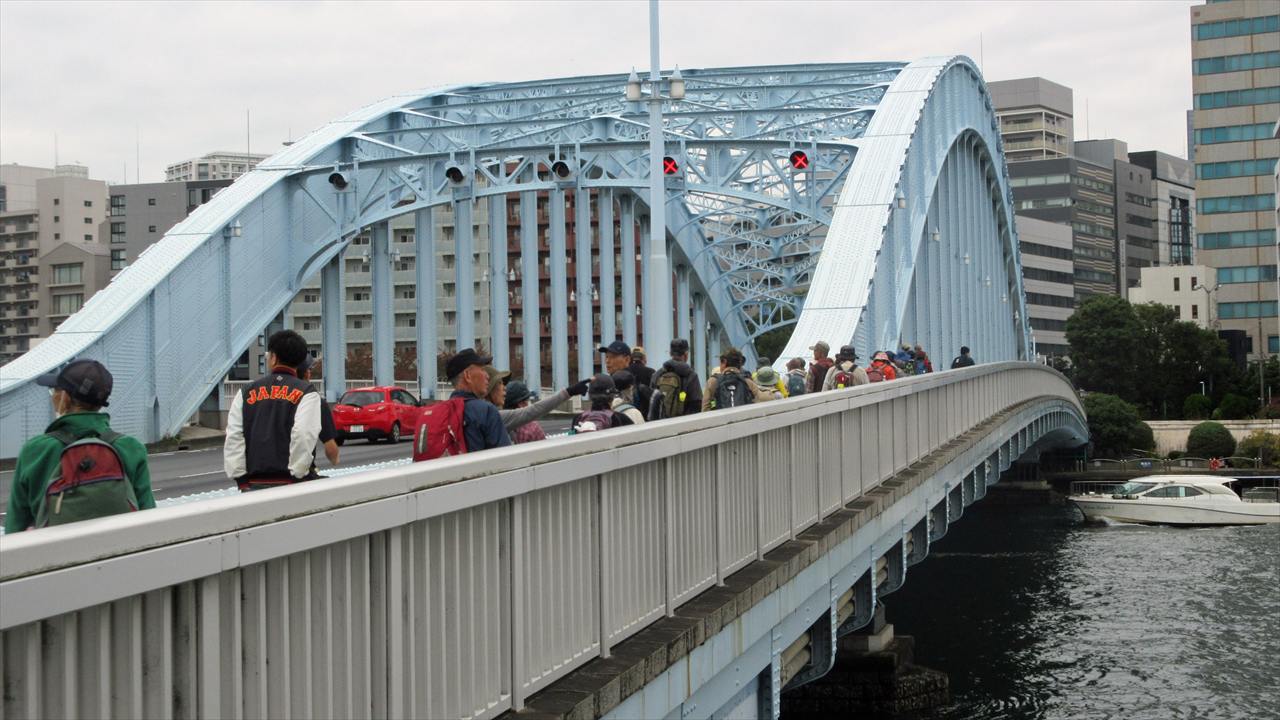 或る時リーダー会で、街歩きLの引退が多く、減った分を山のLが年に1回でいいから山行をいれて欲しいと提案され、うかんだのが、この「赤穂義士の引き揚げ道」です。50年ぐらい前に義士祭当日にこういう催しがあると知ってから、いつか歩きたいと思っていた。結婚して改姓、討ち入りの合言葉の「山」「川」になり、ご縁も満更でもない。調べて歩き、また調べては歩くの繰り返しでコースは決まったが、会山行として纏めるまでは大変で、山とは違った問題があり、これまでの街歩きのLのご努力に感謝。当日は48人の方が勢揃い、奇しくも四十七士ならぬ、四十八士で「引き揚げ道」を辿ることとなった。主だった江東区・中央区の旧跡には立て看板が立ち、説明を読みながら当時を想像して歩く。義士たちは疲れた体で凍てついた夜明けの道を各自得意の武具を携え、戦った装束のまま整然と歩くさまは、異常だったに違いない、夜明けと共に動き出す江戸市民が、大勢見送ったのも納得できる。振り返れば東ハイの四十八士の列は長々と続き、みんな穏やかに歩いていた。山川美恵子