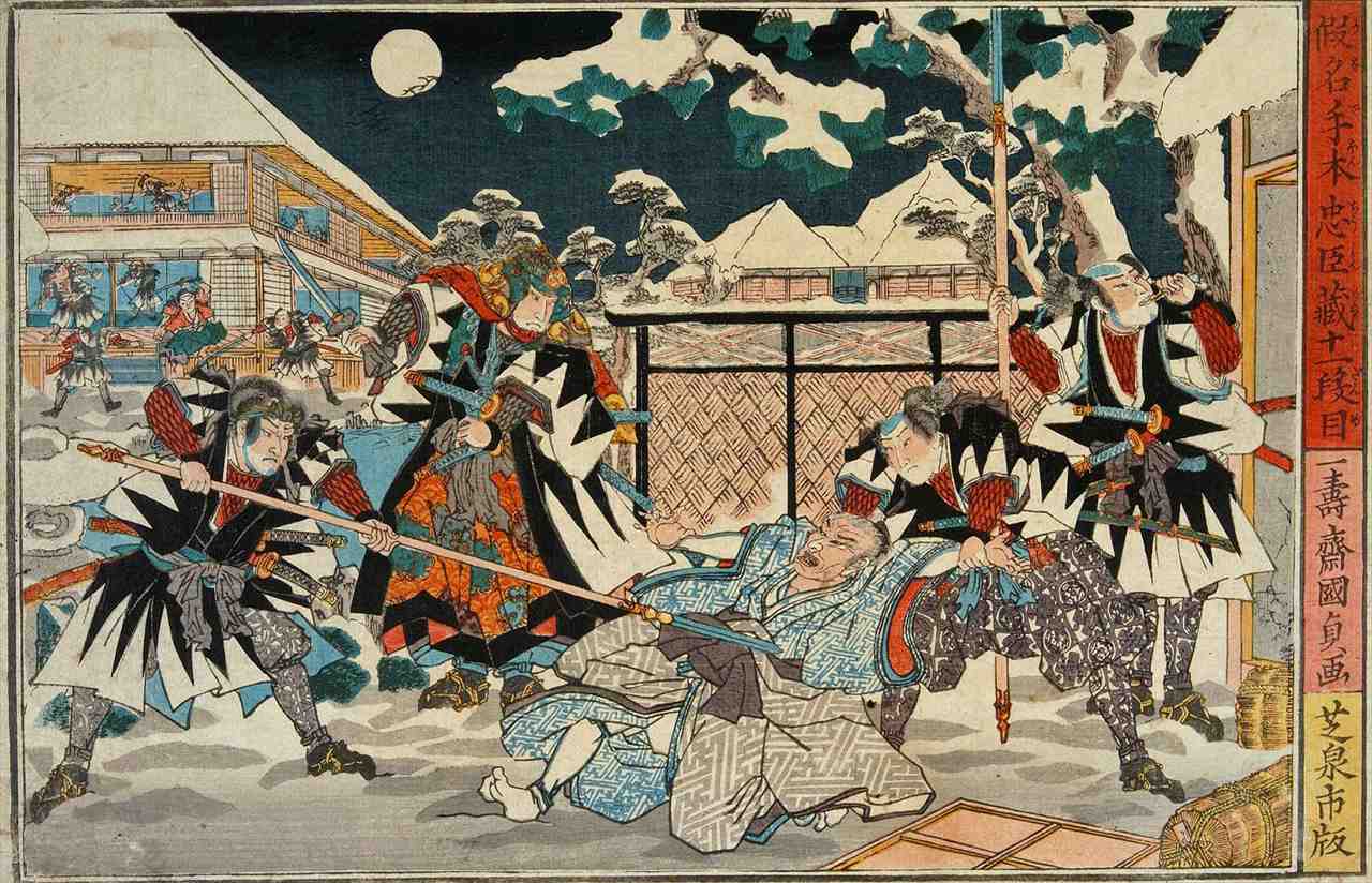 元禄15年(1702年)12月 14日の深夜、堀部安兵衛宅に集結した浪士たちは準備を整え、吉良邸へ向かった。吉良邸近くで他の浪士たちと合流し、表門と裏門から討ち入ったのは寅の刻(午前3時ごろ)であったと思われる。「江戸城松の廊下での刃傷事件」から1年と9か月、ここに至る までの浪士の道のりは長く険しいものだった。