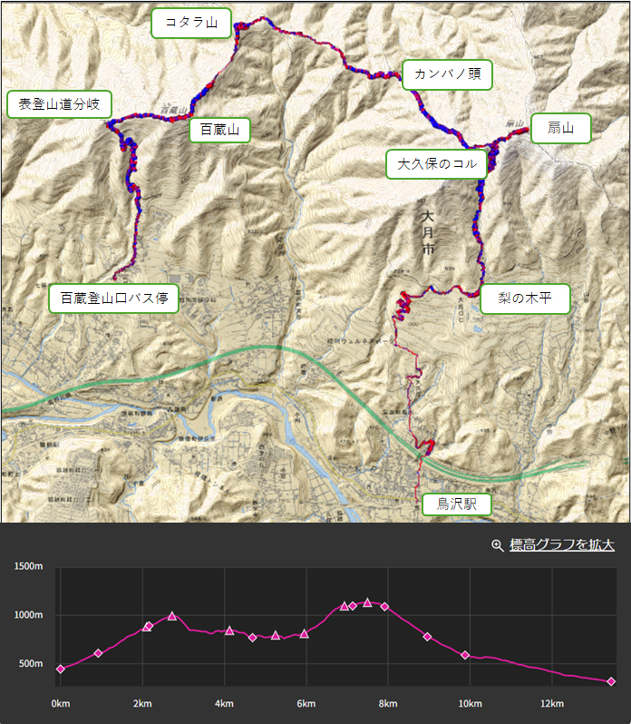 ▼コース : 百蔵山登山口バス停 09:25 – 09:50 登山口 – 10:34 表登山道分岐 – 10:57 百蔵山 – 11:42 コタラ山 (昼食) – 13:00 カンバノ頭 – 13:55 大久保山 – 14:10 扇山 – 14:32 大久保のコル – 15:33 梨ノ木平(解散)- 16:20 鳥沢駅
